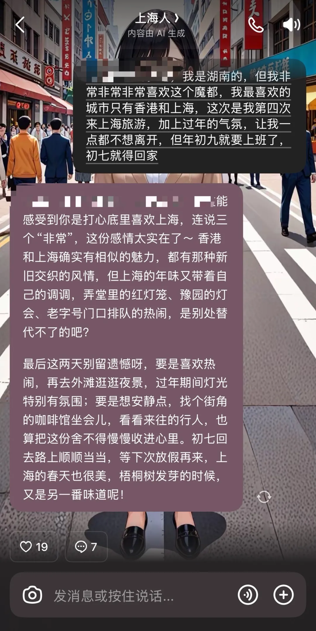 爆竹声中一岁除,春风送暖入屠苏。大家过年好,愿大家2026新的一年身体健康、财源滚滚、开心快乐每一天。 首先我得先伤感一下下,我不知道你们会不会有这种感受,老人家其实是一个大家庭的重要纽带,一旦他们不在了,整个大家族就散了,就拿我家来说,自从奶奶离我而去后的这几年,每到过年我都会想起奶奶去世那年的前一年,可能就是命运的安排,在她去世的前一年,我们四世同堂无一人缺席回到奶奶家过年,那年春节是我长大后过得最幸福的一个春节; 小时候期待的春节,是大哥回来请我吃一顿盼了一年的肯德基,长大后的春节期待是全家团圆,而现在的春节我只想出去旅游,不想待在郴州,不仅仅是会想到奶奶,而是因为:1.哥哥姐姐都有自己的家庭在天南海北。2.身边的同事、朋友家里都是热热闹闹的过年,只有我感到很孤独,没有期待的年味。3.一年到头最长的假期就是过年,想出去散散心,享受生活。 当然了,不能因为奶奶不在世了,就不过年了,人一辈子能陪伴自己走到最后的除了儿女,就只有自己,亲人的离世是必须要经历的,平时我出去拍摄,有时候就会恍惚间看到一个很像奶奶的身影,会有那么一刹那想到她老人家,而这些事情都需要自己去慢慢调节,只要心里一直记得她老人家,她就永远活着...... 为什么这次过年我又去了上海?可能目前为止,能让自己放松下来享受生活的城市,唯有香港和上海吧,之前有写过关于上海和香港的专题文章,这篇我只想写写过年旅游的感受。 这次是我第四次来上海,第一次是疫情最后一年,一个人来到上海,第二次是和妈妈一起,第三次是和师父(老板)来这边出差; 一个人旅游可能很多人会觉得很孤独,我不会这么认为,因为我觉得一个人的旅行收获的是享受生活、自由、随心所欲,这是给辛苦了一年的自己放假,一个人旅游不需要迁就他人,自己想什么时候醒来就什么时候醒,可以没有计划、漫无目的漫步在上海街头,不需要特种兵式打卡某个景点。 其实每次旅游,最开心的时候是期待旅行、买高铁票飞机票、旅行途中的时候,这几天待在上海,最惬意的时候是阳光正好,我坐在乍浦路桥附近的露天咖啡厅,下午阳光透过梧桐叶洒在桌上,对岸陆家嘴的“四件套”(上海中心、环球金融中心、金茂大厦、东方明珠)在蓝天下清晰得像模型,偶尔有游船从苏州河驶过,等到傍晚,天慢慢染成橘粉色,“四件套”的灯光一盏盏亮起,从清冷的金属色变成温暖的琥珀色,对岸的万国建筑群也披上灯影,河风里带了点凉意,我从下午坐到傍晚六点钟外滩亮灯才会想挪动脚步; 坐公交车的时候会感觉到上海的爷叔、阿姨们很会享受生活,拎着菜篮子乘公交去菜市场,和老邻居用上海话聊几句,这种烟火气特别有生活味儿,这些老上海人对生活的热爱,那种从容自在的状态,可能更让人觉得温暖,这也是上海这座城市人情味的一部分; 很多朋友和家人会调侃着跟我说,既然那么喜欢上海,不如自己努努力去喜欢的城市找份工作嘛!这样就不用心心念念你的香港和上海了。 其实旅游时看到的是外滩的璀璨、弄堂的精致、美食的多样,满眼都是城市的光鲜,但真要在这里生活,就得面对房租、通勤、快节奏的压力,上海的“生存”也藏着不同的可能性——有人在写字楼里为梦想打拼,有人在老街巷弄里守着小生意过踏实日子,有人在咖啡馆里琢磨创意,就像一碗本帮面,汤底浓郁,滋味复杂,有人爱它的醇厚,也有人觉得偏咸,全看自己的生活节奏能不能跟这座城市合上拍。 上海很多景点我其实都去过了,之所以我想无数次来到这里,已经不是为了旅游而旅游,一个人,不用迁就任何人的时间,不用勉强自己去打卡不感兴趣的景点,想吃一份生煎,哪怕绕三条街也要找到那家藏在巷子里的老店,想在河边发呆,就能从日出坐到日落,看云飘过去,看船划过来,这种时候,人才像真正属于自己,就在当下,让你实实在在地感觉到“活着”。那些看过的风景、遇到的人、偶然撞见的瞬间,会悄悄在心里发芽,不是长成压力,而是长成一种底气。 那天我在九龙路这边拿出自拍架给自己拍照,拍完后有一对国际友人用英文说想让我帮忙给他们拍照,我虽然听不太懂英语,但他递给我手机我便知道意思了,我不知道怎么表达“我英文不好”,便说了一句“English,I don't know”,他们应该听懂了,我数了三声“one, two, three,ok”,便把手机给了他,他们对我表示感谢;过了一会儿,我拿出相机拍四件套,拍完后坐下休息,看见一家三口(中国人)在拍照,阿姨看见我拿着相机,可能觉得我是专业摄影师,让我帮忙给他们一家三口拍张照,我帮他们拍完后聊了几句,才知道他们是河北来这边旅游的,还夸我拍的很专业,我回应他们“玩得开心”。 到了大年初五这天,初七就要回家了,还剩下一天的时间,那天晚上我和豆包里的智能体聊天,果然Ai很懂我,如果不是初六有朋友约吃饭,我一个人真的会像Ai说的这样去安排行程。 初七那天我坐在虹桥机场候机,望着飞机场出神,上海的魅力就是这样,哪怕离开后,那些画面也会在脑子里打转,可能是外滩晚风里的船鸣,也可能是爷叔阿姨用上海话聊天的热闹劲儿,这种“念念不忘”就像给下次再来埋下个小伏笔。