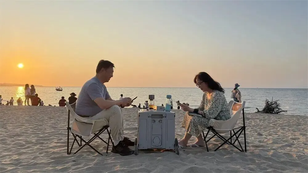 游客在沙滩上惬意地欣赏落日