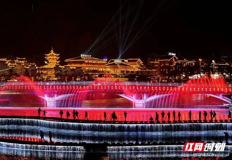 在七十二奇楼,56个特色节目轮番上演,万盏花灯映照吊脚楼群。广州游客李小姐边直播边感叹:“舞狮、打溜子、红灯笼……仿佛穿越到了古代的土家集市!”五湖四海的游客沉浸式解锁别样土家年味,实现从“看景”到“入景”的深度体验。