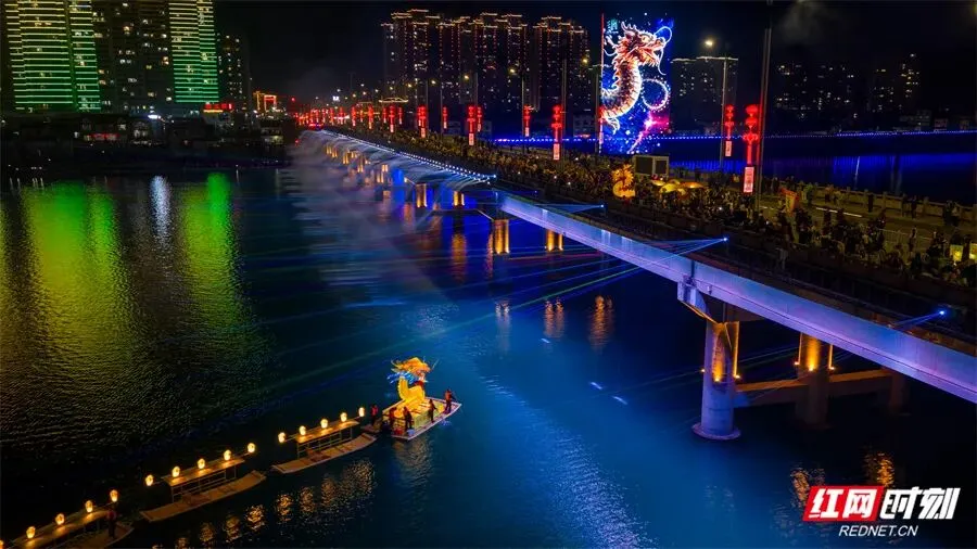2月21日(正月初五),澧水河畔流光溢彩、万人空巷。第四届慈利板板龙灯艺术季核心主题活动璀璨启幕。作为国家级非物质文化遗产,慈利板板龙灯以“水陆空”三维联动的全新形式惊艳亮相,古韵与新意交融,让市民游客在家门口尽享一场震撼人心的非遗盛宴。