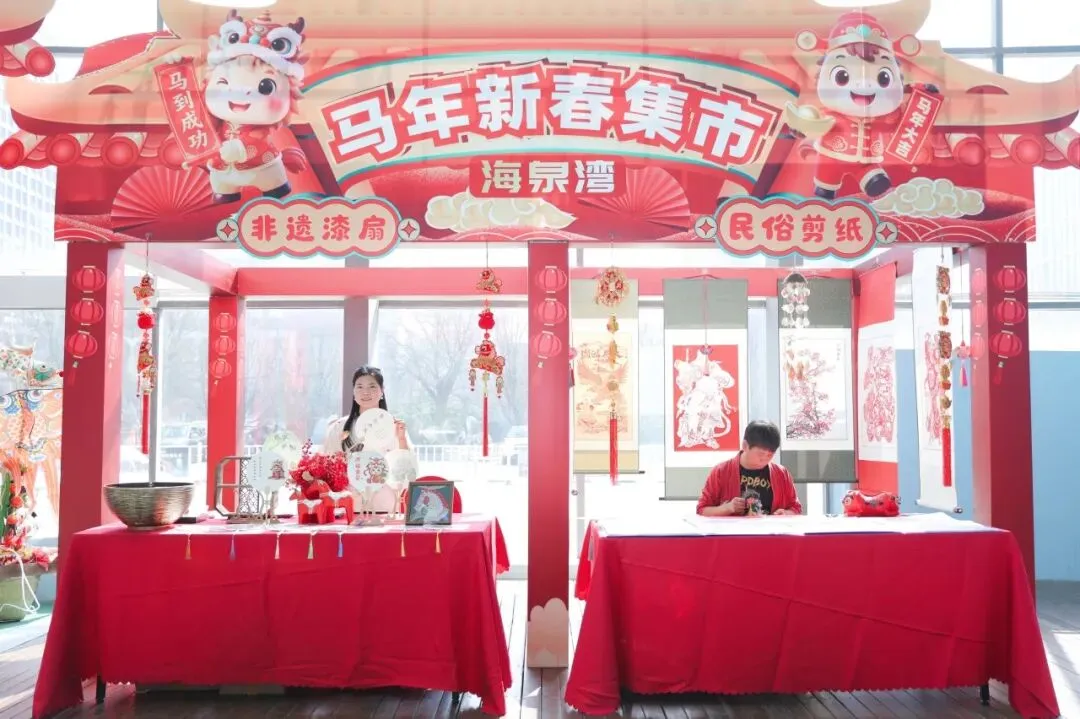 咸阳海泉湾度假区马年新春搭建民俗集市,吹糖人、非遗漆扇、捏面人、剪纸等非遗项目在这里汇聚。