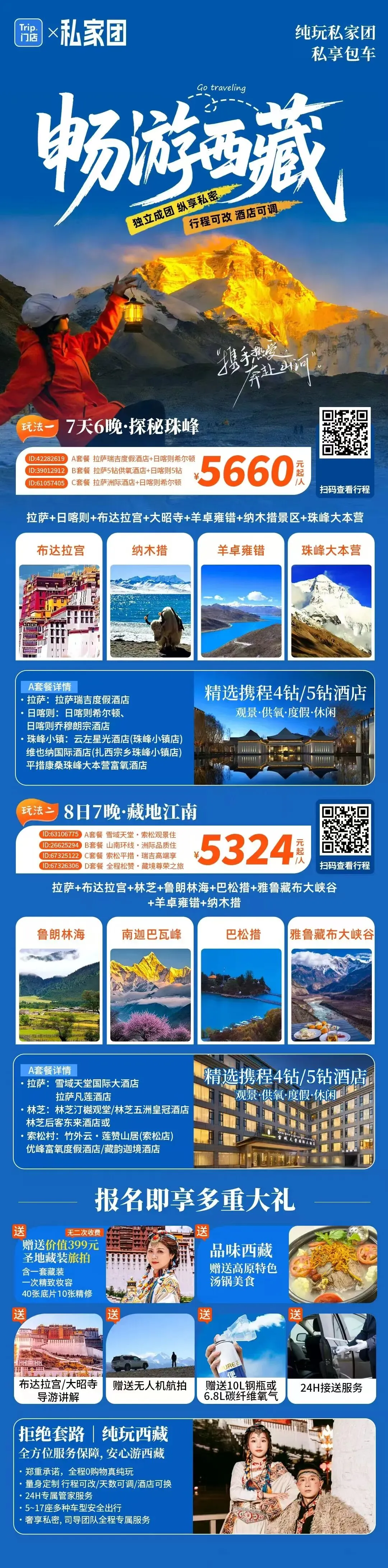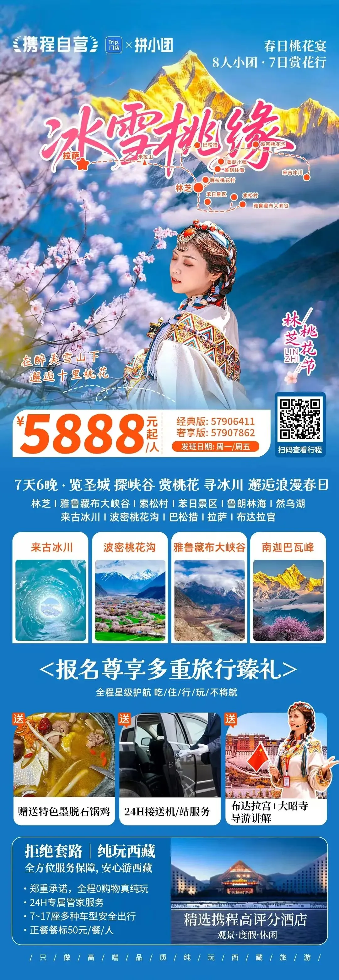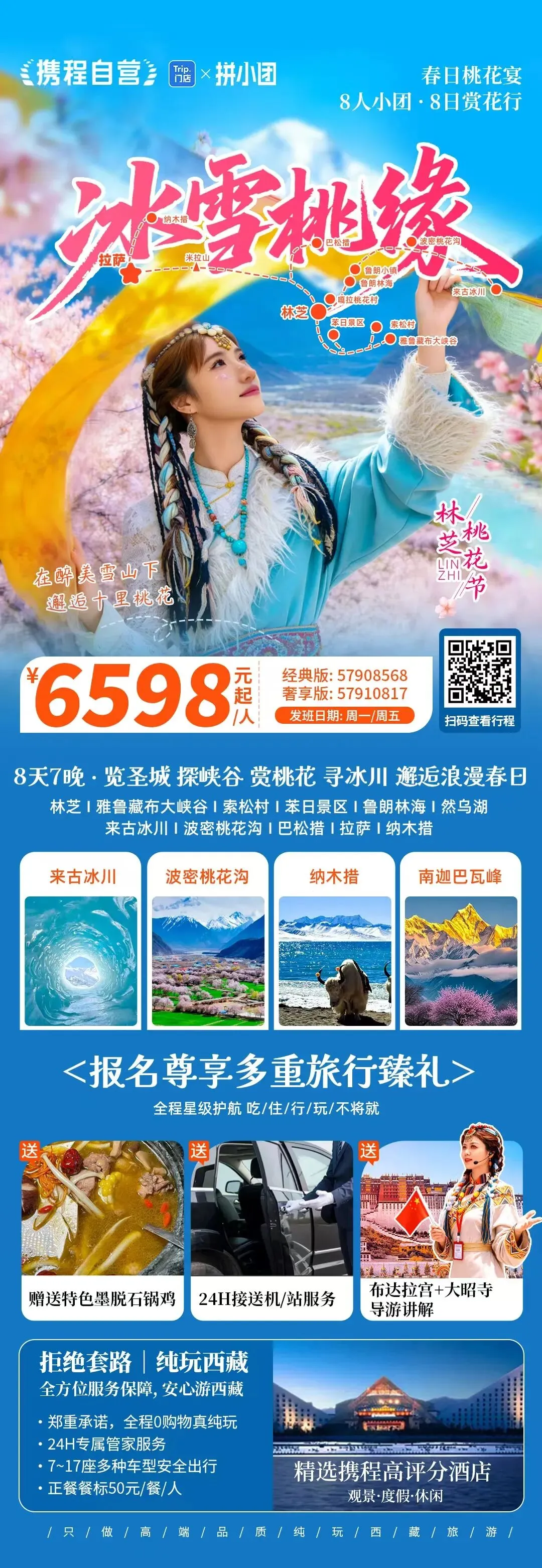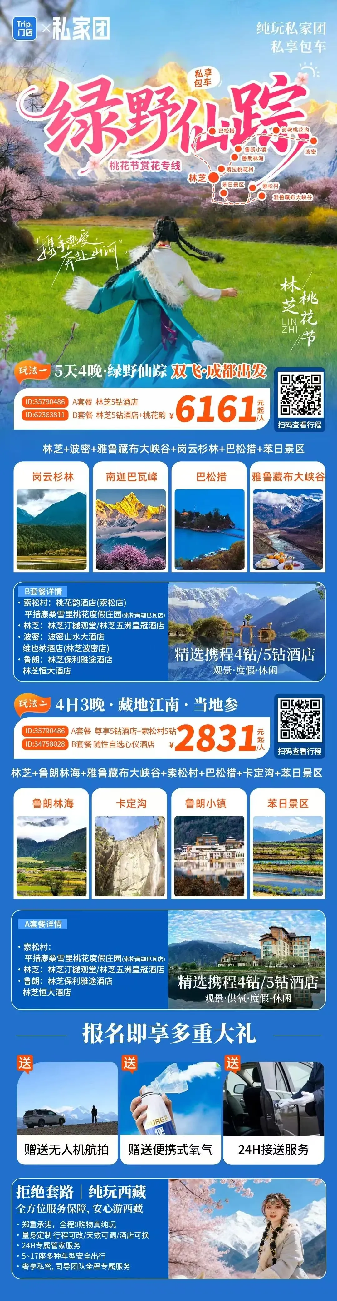 这组林芝桃花节海报覆盖了从3999元短途到6598元深度的全价位段,且主打纯玩、小团、高星酒店供你选择。