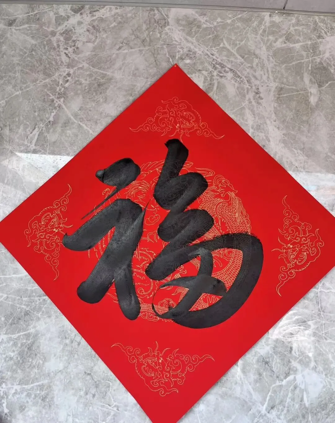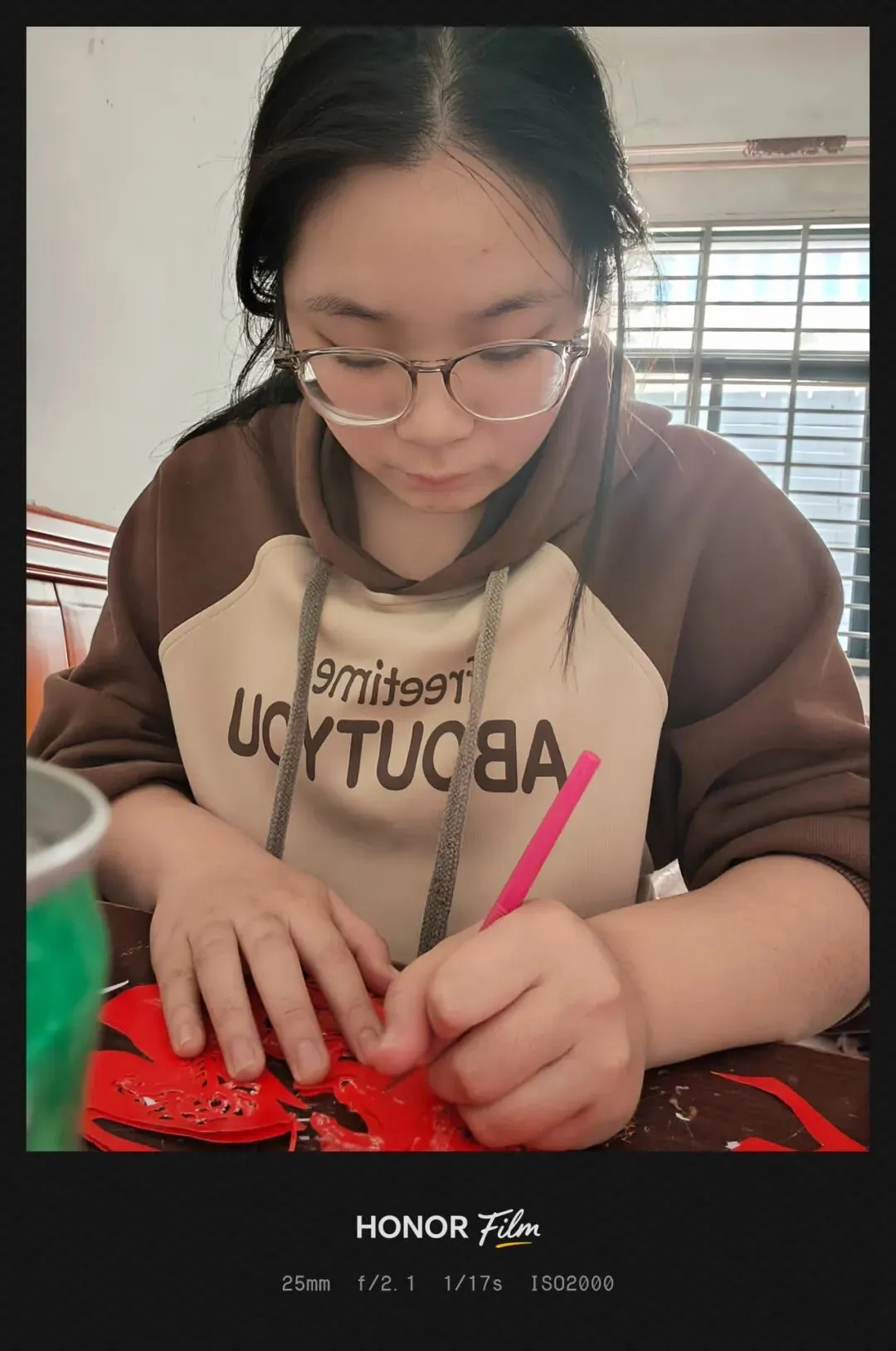 蔡佳莹同学首次尝试刻刀创作“福马”窗花,为融合马身与“福”字结构反复修改草图,让马身嵌于“田”字、马首探出“礻”旁,实现字中有画,同时还为作品添祥云花卉,藏入龙马精神的美好寓意。