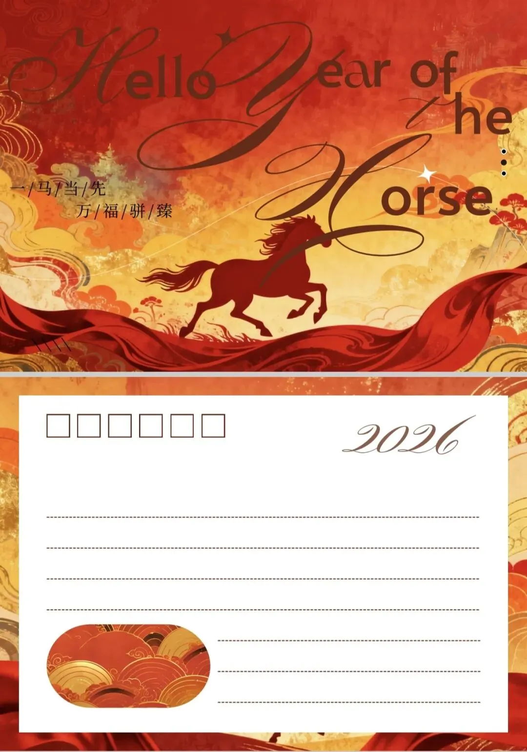 自制的马年主题明信片,以中国红为主色调,让春联灯笼的年味跃然纸面。她在明信片中央绘上无缰奔马,寓意时光疾驰、奋进不负春光,下方红底金边的锦布如国旗飘扬,寄托对祖国发展的期许,搭配英文字样让明信片兼具传统年味与时代气息,收纳对家与国的美好祝愿。