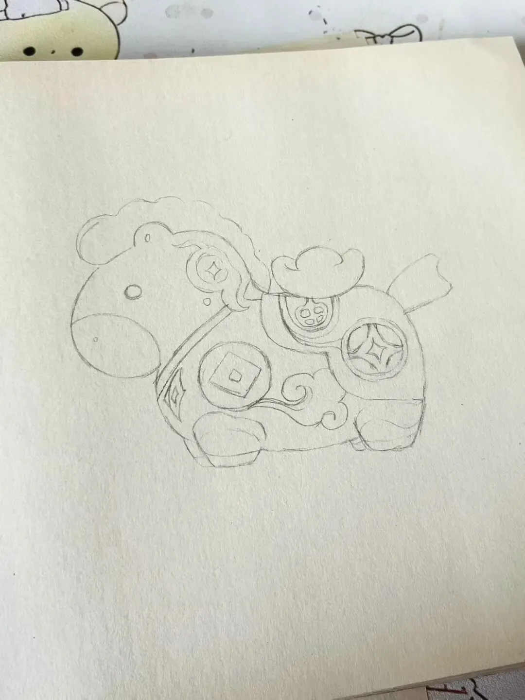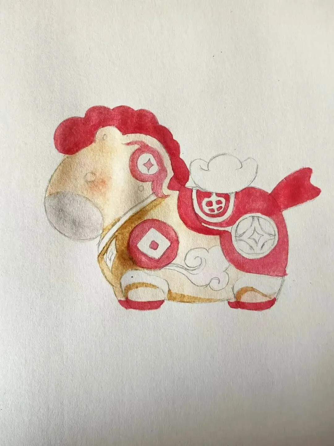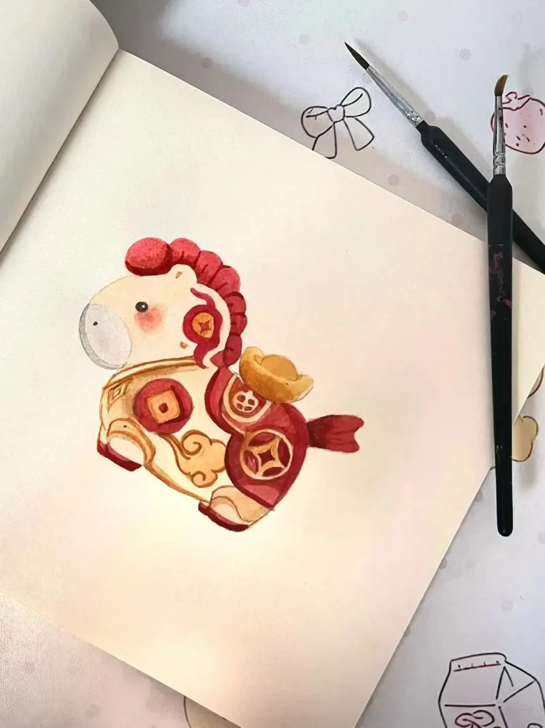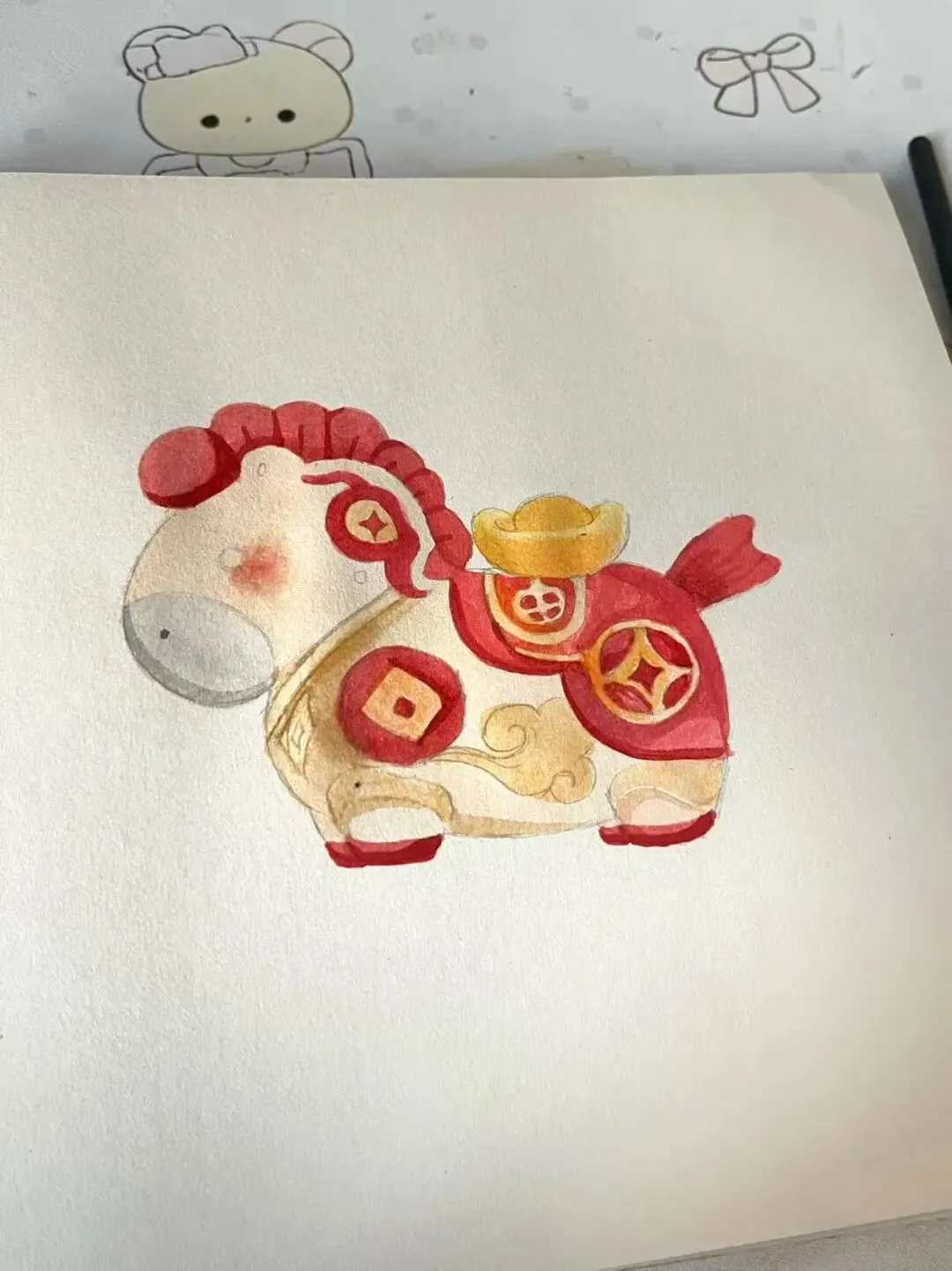 从基础线条练习入手,掌握马的形态结构与动态特征,重点练习水彩色彩层次晕染技巧。她克服水分控制不当导致晕染过度的问题,采用干画法分层上色,将马与金元宝融合,加入铜钱、祥云等元素,让画作兼具艺术美感与吉祥寓意。