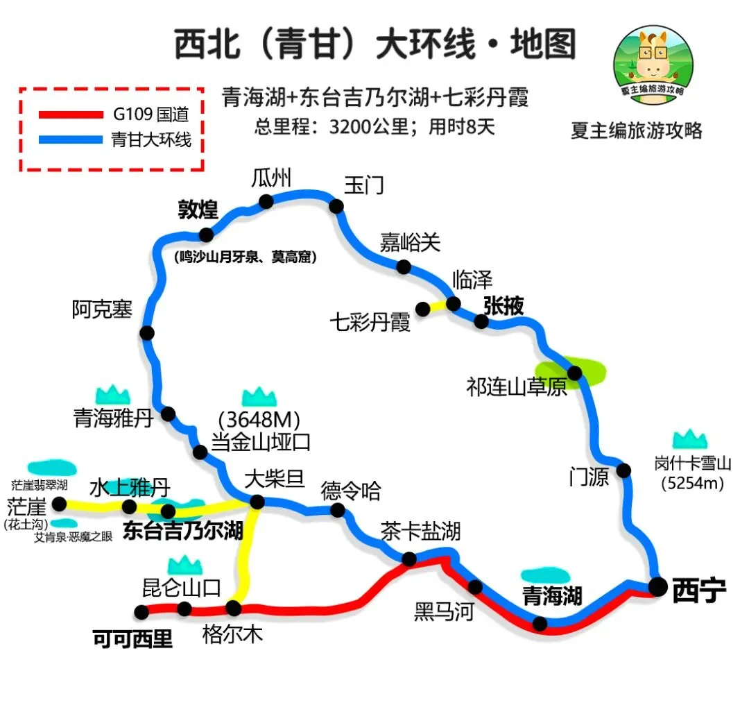 自驾信息:全程3200公里,自驾需7-10天。线路海拔2000-4000米,属于青藏高原东北边缘,部分垭口可能会有高原反应,自驾难度低,但需长途跋涉,路况良好,沿途加油站、充电桩都饱和。