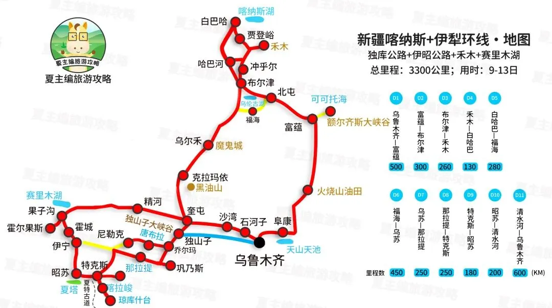 行程安排:乌鲁木齐→富蕴→布尔津→禾木→白哈巴→福海→乌苏→那拉提→特克斯→昭苏→清水河→乌鲁木齐。