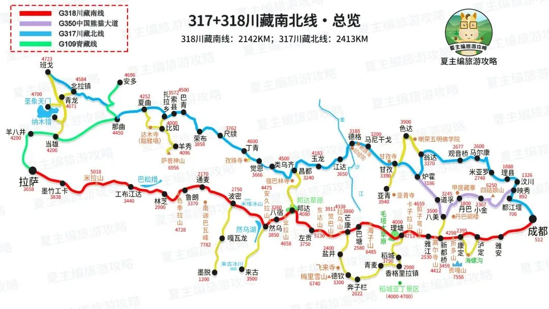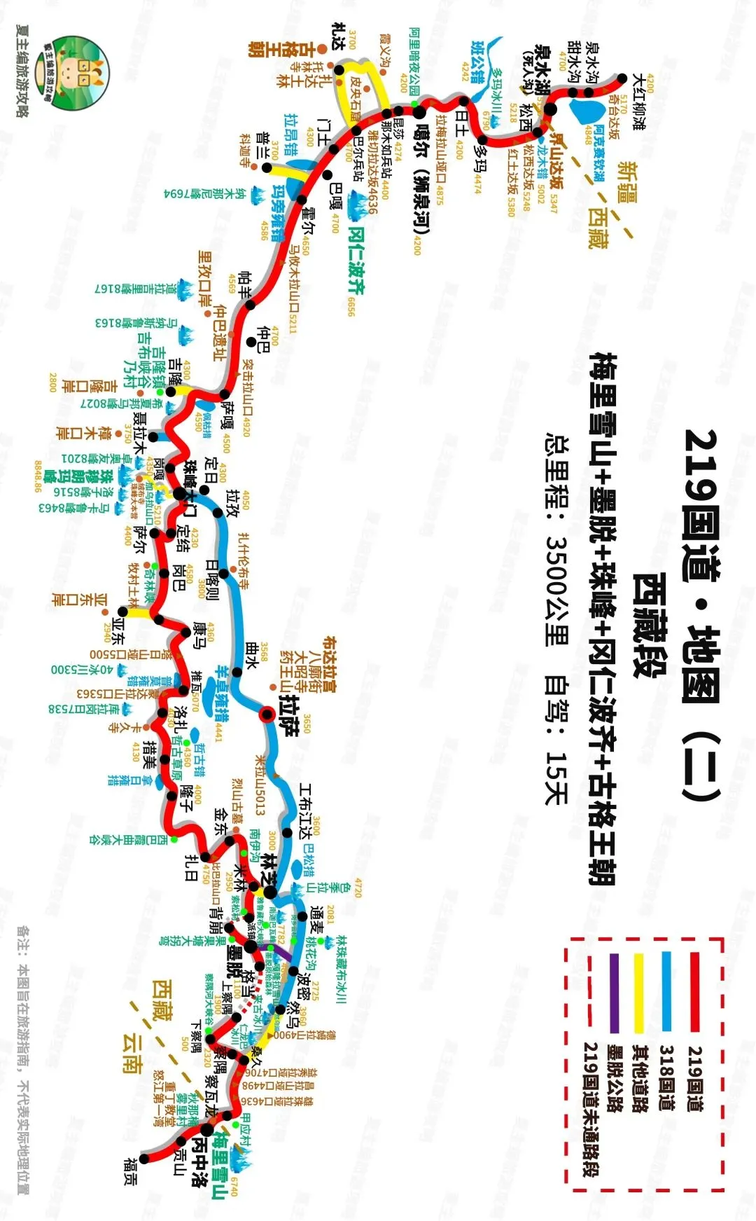 自驾信息:总里程2573公里,自驾需9-11天。线路海拔2000-4000米,一般不会有高原反应,盘山、临崖、邻水路段多,自驾有一定难度。