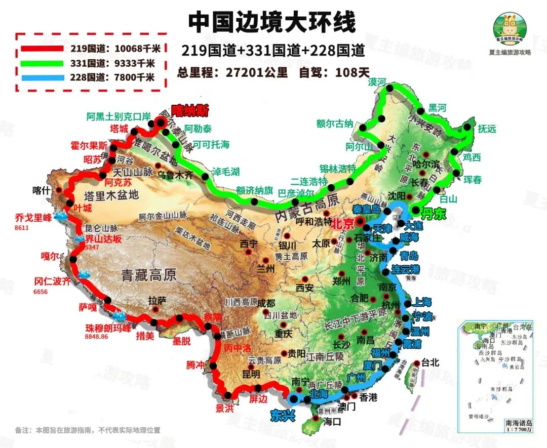 线路介绍:一条真正环游中国边境的线路,可途经14个国家与中国陆地边境接壤的地方,由“中国最长国道”G219线、“北境公路”G331线与“国家东部海岸线公路”G228线组成。