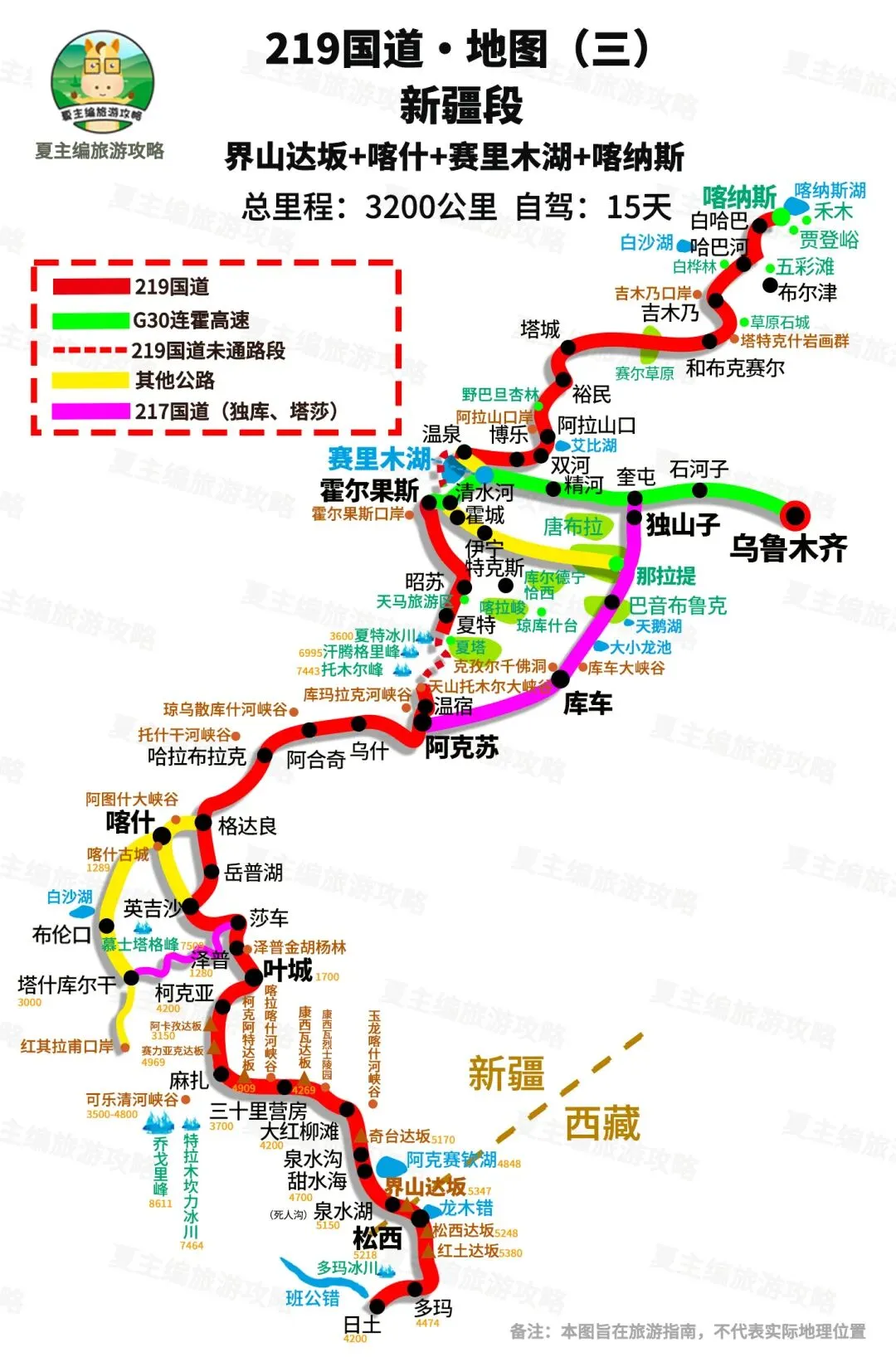 自驾信息:5000公里,自驾需13-17天。全程路况良好,小轿车、电车可正常通行。南疆地势广阔雄伟,每日行车时长较久,沿途景点较少,需集中精力驾驶。除了帕米尔高原区域的喀什、塔什库尔干、红其拉甫附近的部分地区达到4000米海拔,其余地区皆无需担心高原反应。