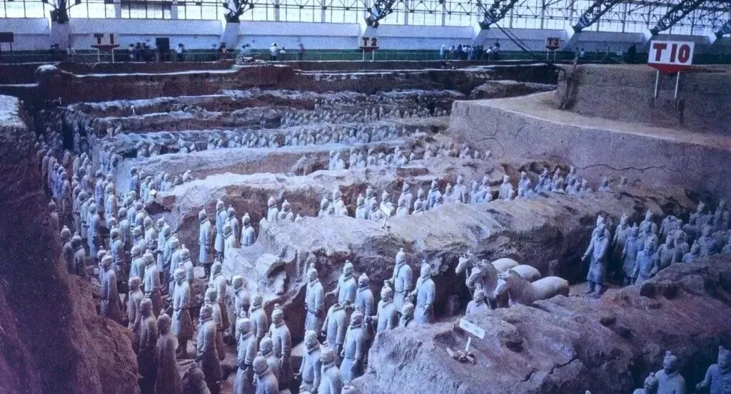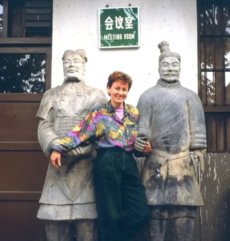 这个两侧站着的叫仿制兵俑,石灰色身子被风雨打出一层旧斑,夹在中间的旅人花衬衫颜色跳脱,手挽着俑臂,眼睛笑成月牙,头顶一个牌子写着会议室,场面有点妙,像古今打了个照面,爸爸看了照片笑,说九十年代的外宾就爱这么拍,回去一张冲洗出来能摆满客厅墙,现在随手拍一千张,真要留住的反倒只剩一两张。