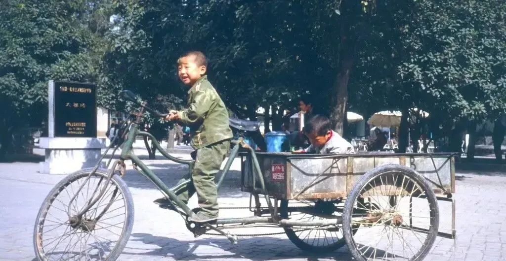 这个铁家伙叫脚蹬三轮,前边一辆老式横梁车,后头接个方方正正的铁斗,螺丝外露,边角有锈,孩子抓着弯把咧嘴笑,另一位窝在车斗里翻瓶盖,我爸那会儿赶集就靠它,往车斗一垫门板,西瓜码两排都不晃,转弯时要靠腰,车把一压一提,才过得去窄巷口,现在物流一通电话到家,三轮的吱呀声越来越少了。