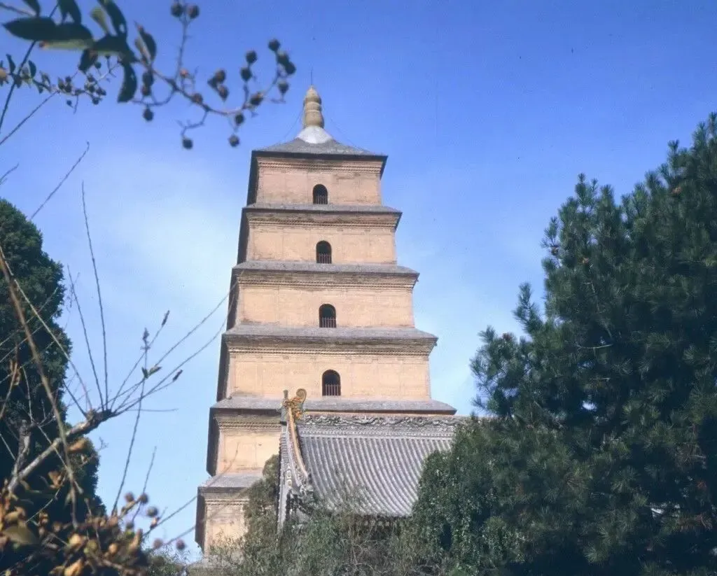 这个耸在画面里的塔叫大雁塔,土黄砖身一层叠一层,四角起翘,塔窗黑洞洞的像眨眼,塔底檐兽立在那儿不动声色,风一吹,树梢刮着瓦片边,沙沙作响,妈妈说那年登塔要买纸票,检票口会往袖子上钤个章,现在刷码咔哒一下就进去了,城南的风也比以前更快了。