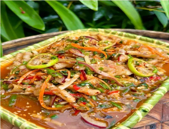 舂鸡脚是把酸辣爽脆刻进骨子里的小吃。把煮熟的鸡脚去骨,和切好的黄瓜、番茄、洋葱、小米辣、柠檬片一起放进石臼里,再加入鱼露、生抽、白糖,握着木槌用力舂打。