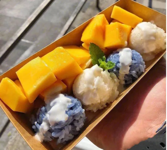 吃的时候,把芒果块和糯米饭拌在一起,裹上椰浆,芒果的甜、糯米的香、椰浆的浓郁融合在一起,口感软糯香甜,每一口都像在吃甜品,吃完心里暖暖的。