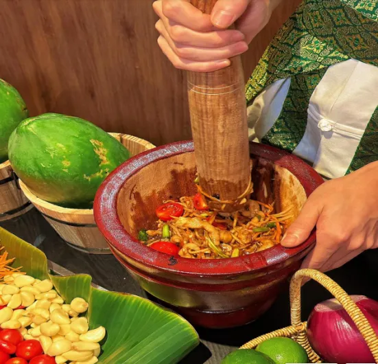 舂木瓜和舂鸡脚做法相似,却是另一种清爽滋味。把生木瓜切成细丝,和小米辣、蒜、柠檬、香菜、豇豆、番茄一起放进石臼里舂打,加入适量盐、白糖、鱼露调味。