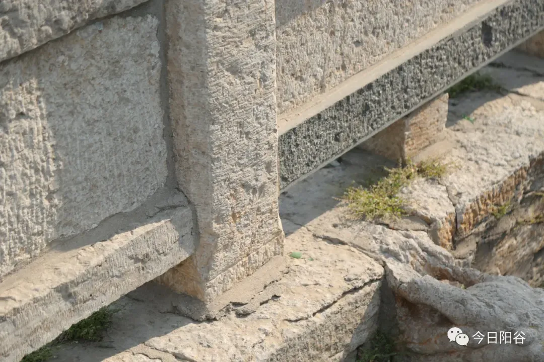 桥设三空,由于桥的跨度较小,不用拱形,使桥面可平铺石板便于通行。桥基石柱上端,各雕一石龙,扬头摆尾,妙趣横生。桥的四角则各雕一石虎,伏爪静卧,虎首眺望方向各不相同,气势威严。桥身两边各有80厘米左右的一行石栏,石栏间有望柱一十二根。而在各望柱的顶端,还均雕一石狮,搔耳弄腮,形态各异,诱人止步。望柱间以石板相连,石板上下用方形石柱相匣,如镜壁镶。在望柱、石版和上下石柱上,雕有各种生动形象的神话故事和山水、人物、鸟兽图案,如 :“八仙过海”“寿星下棋”“天马行空”“铁杵磨针”“柴王推车”“牛车出行”“鹿鹤图”“蝙蝠寿字”及梅花、绿竹、飞鸟等等。雕刻惟妙惟肖、栩栩如生。尤其是在南排石板靠中间的浮雕“牛车出行图”,记述了明代阳谷县丞管一顺“车去留犊”的真实故事,且《阳谷县志》也记载了其故事的真实存在。