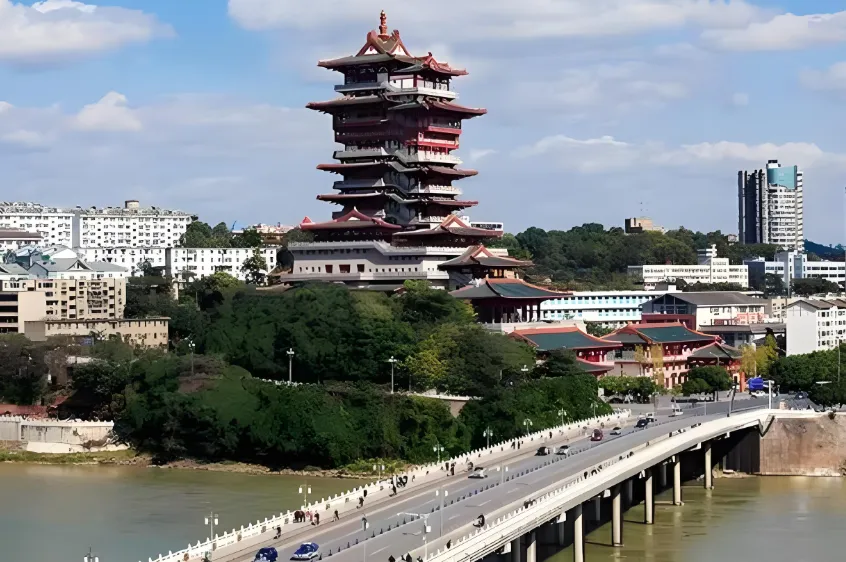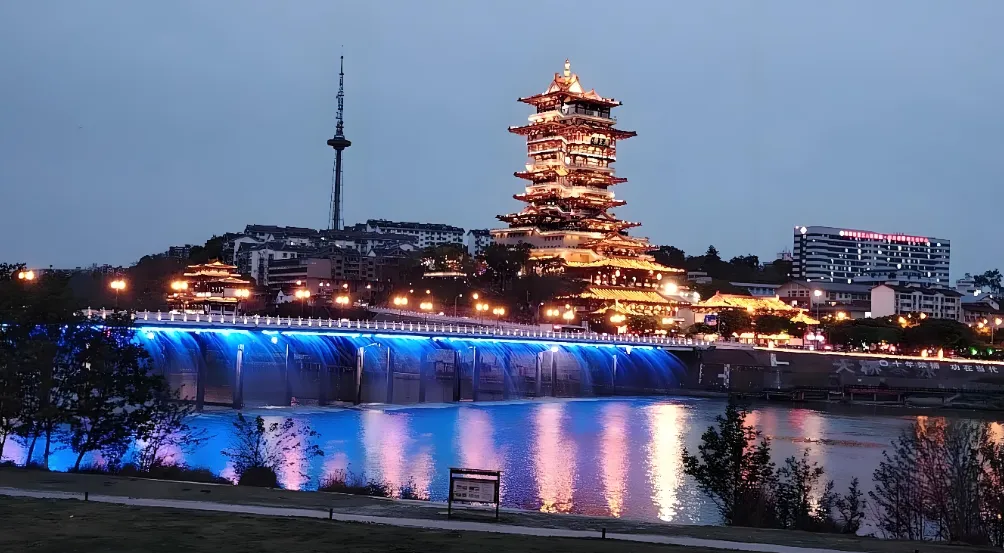 第六站:越王楼“天下诗文第一楼”,就在绵阳市区。登上楼顶能俯瞰整个涪江和科技城新区。晚上的灯光秀是一绝,用激光打出《滕王阁序》的诗句,特别有文化感。门票50元,学生半价,1.2米以下免费。