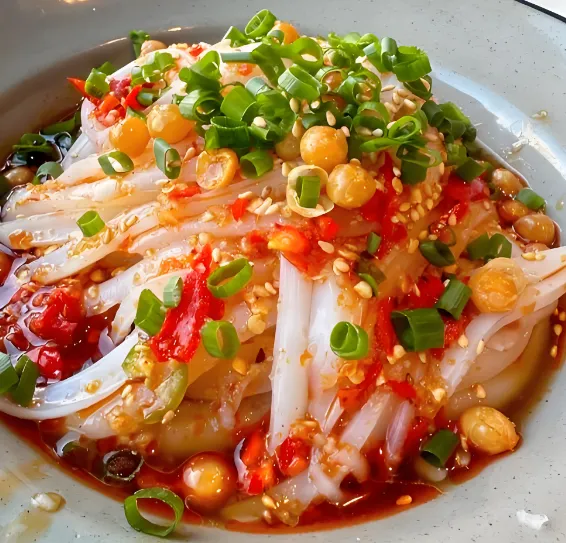 第三美食:梓潼片粉像凉粉但更筋道,切成薄片,拌上红油、醋、蒜泥。推荐“老号片粉”,在梓潼县城。老板是个大爷,动作麻利,拌料的手法一绝。5元一碗,便宜又好吃。
