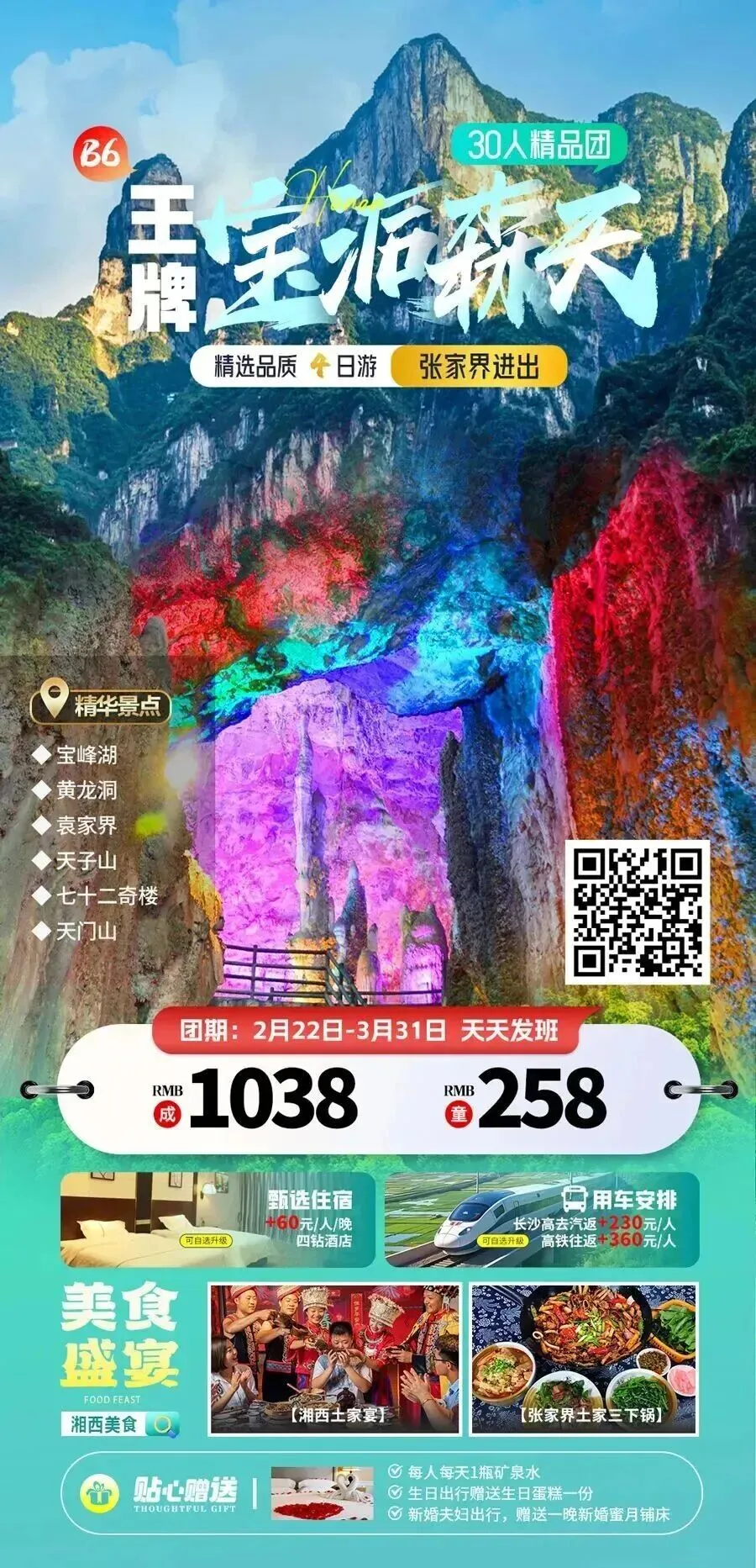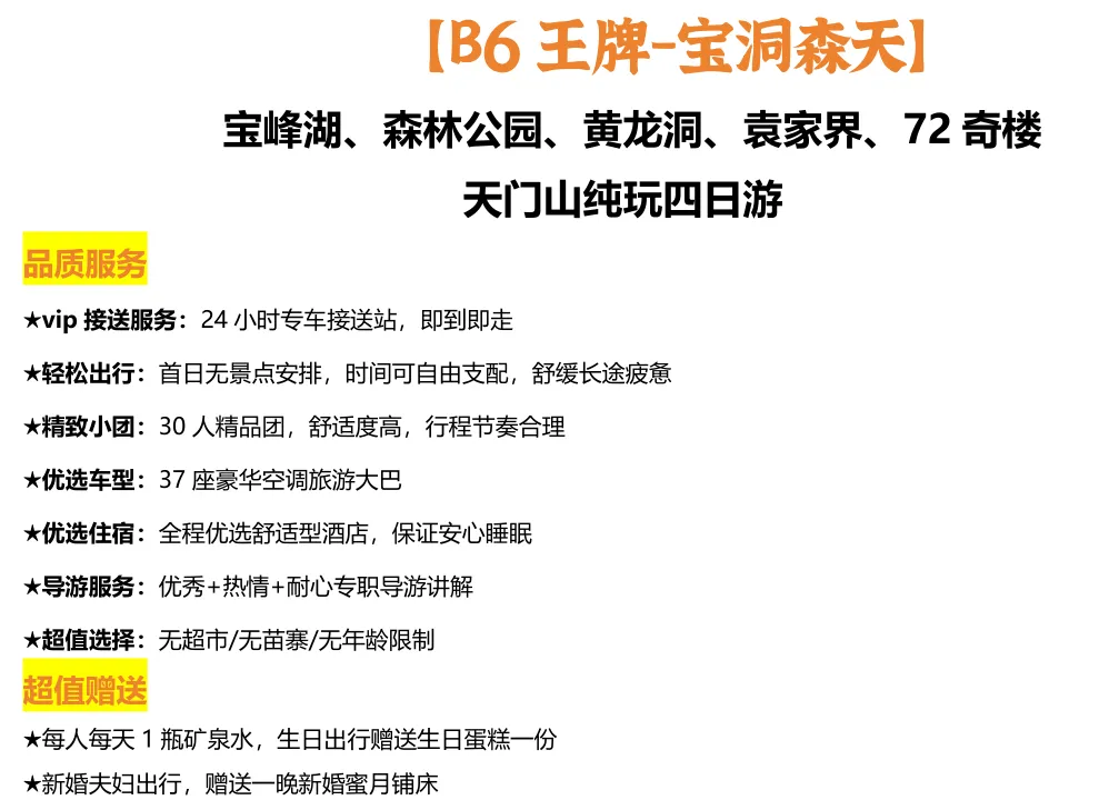 【B6线张家界四日旅游】张家界起止:张家界国家森林公园+宝峰湖+黄龙洞+袁家界+七十二奇楼+天门山纯玩4日游-高铁站机场24h接站-天天发班