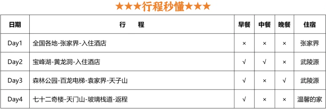 💛费用包含:张家界24h接送站+4天旅游车费+景区大门票+3晚住宿+3早餐2正餐+导游服务+保险