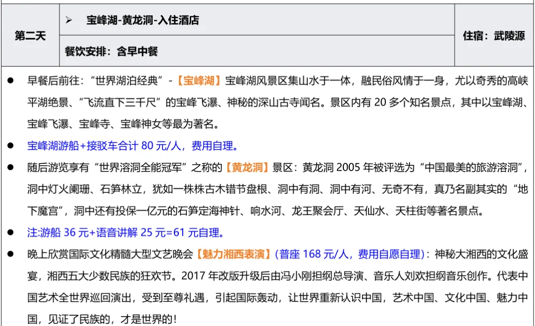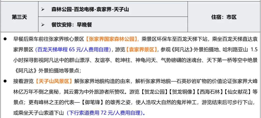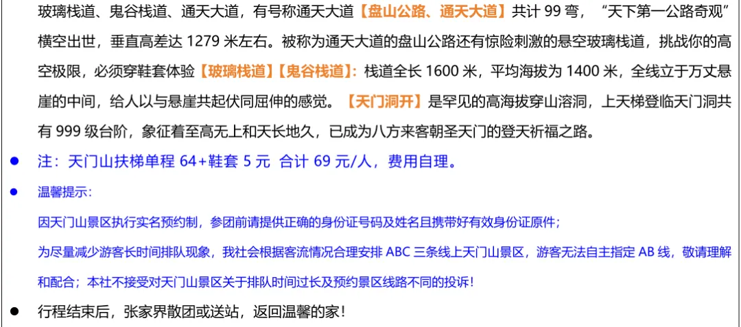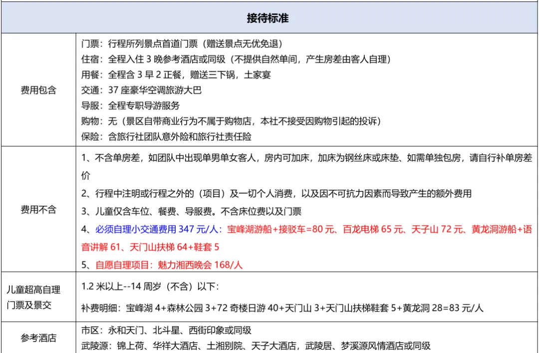 备注:成人需自理景区小交通347元(宝峰湖游船+接驳车=80元、百龙电梯65元、天子山72元、黄龙洞游船+语音讲解61、天门山扶梯64+鞋套5)