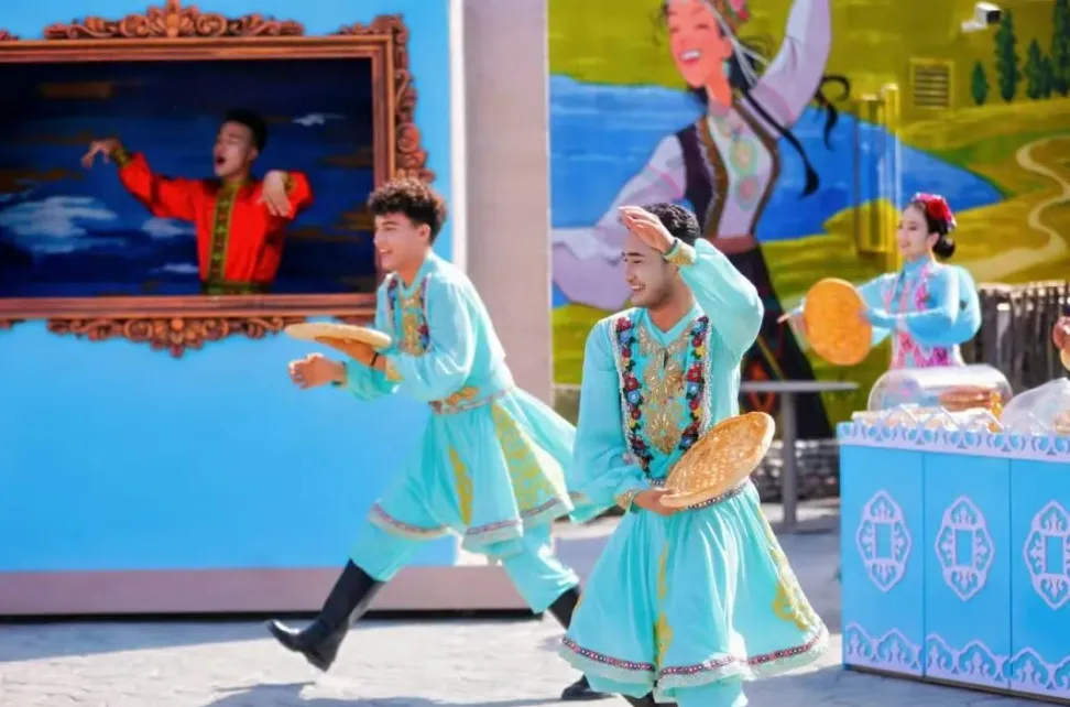区别于传统的观演,哈茵赛村的特色民俗演艺采取进行式表现手法,打造最具生活感、参与感的沉浸体验。清晨,游客可随着“幸福代言人”的歌声探访宝藏小店,在毡房亲手捶打奶疙瘩,或守着馕坑等待第一缕麦香。抛酸奶时的飒飒、烤馕坑里的哐哐、制器皿的铛铛,节奏明朗,律动欢快,奏响了生活的交响。