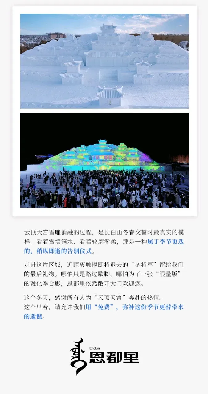 吉林省著名景区进入“告别季”,即日起全天免费开放!长白山云顶天宫雪雕,全天免费开放!