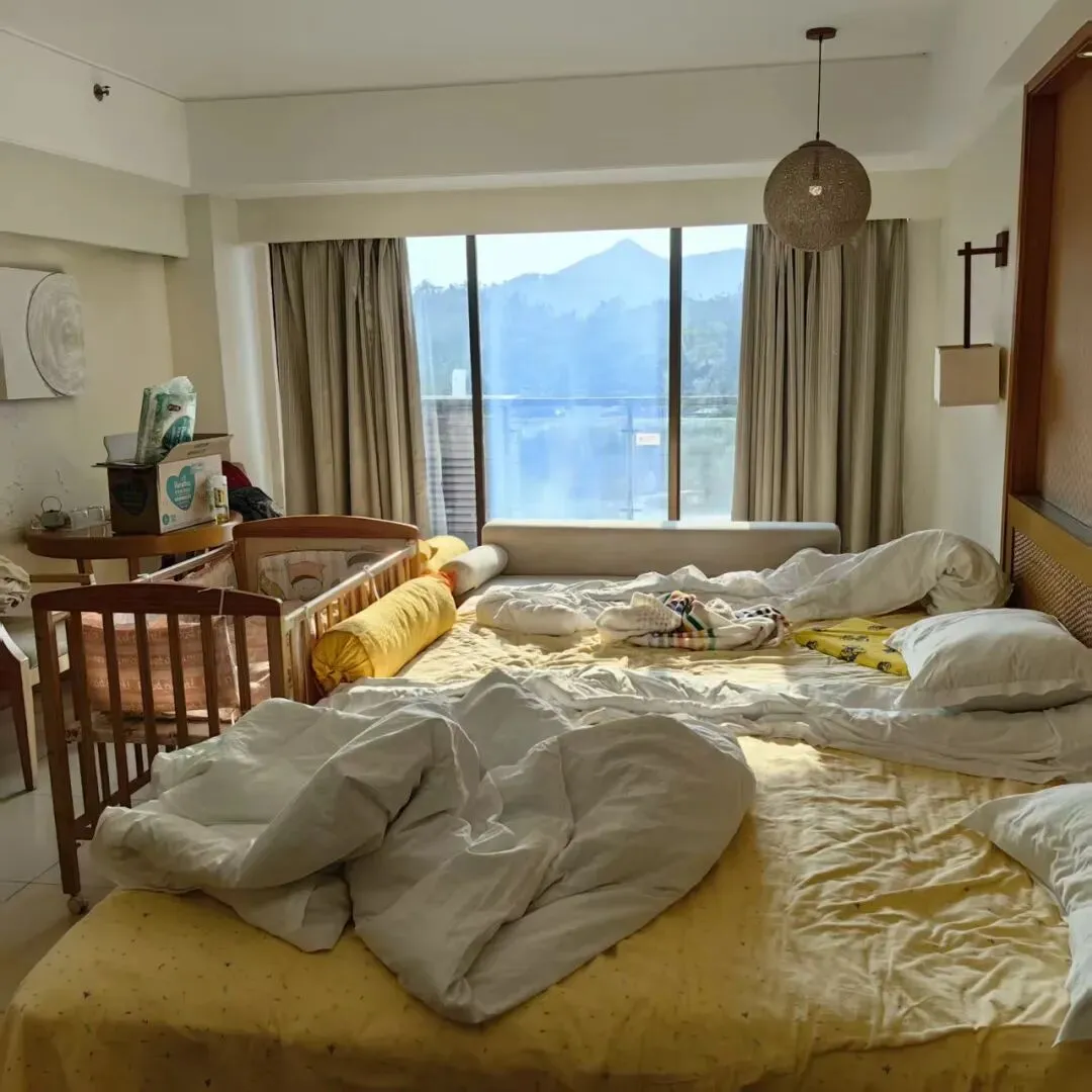 进房间第一件事:给前台打电话,要了一张婴儿床,再要一床被子。把两张床拼成一张大床,用婴儿床挡住一侧,再用沙发靠枕和卷起的被子围出“护栏”,铺上两张家里的床垫,再配上宝宝自己的枕头和被子,给宝宝打造出安全的睡眠区。宝宝睡得够,才有精力开启接下来的旅程。