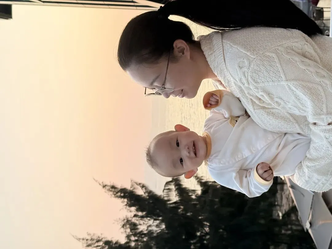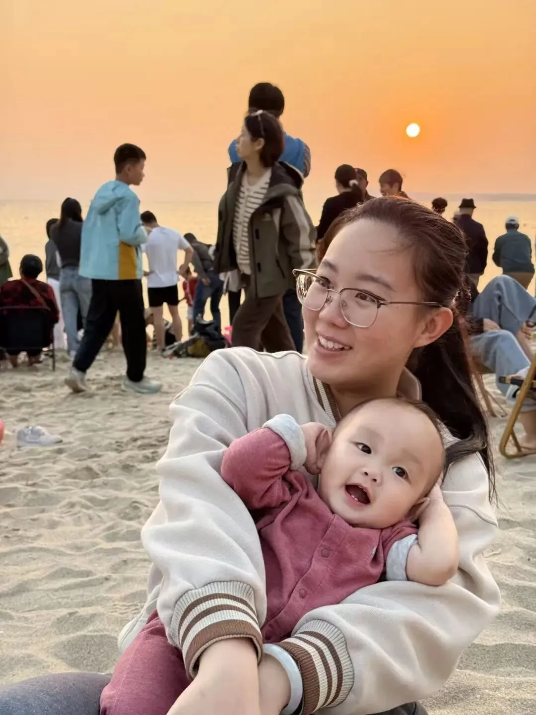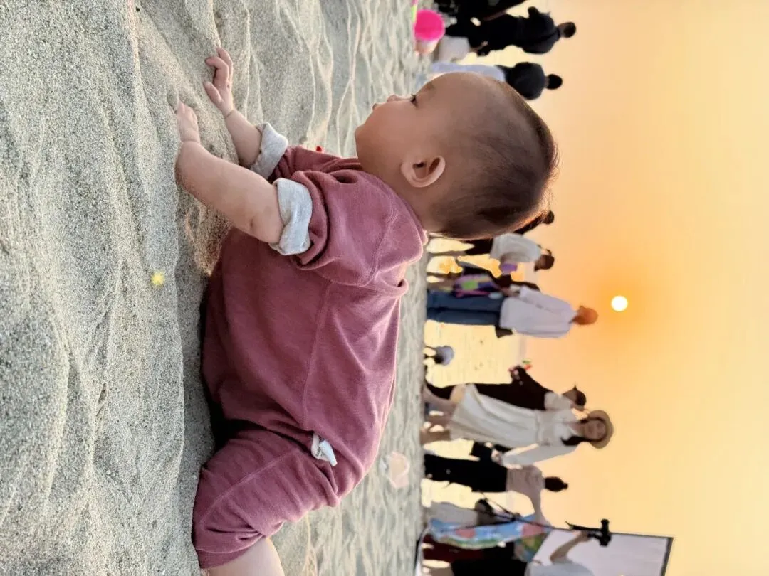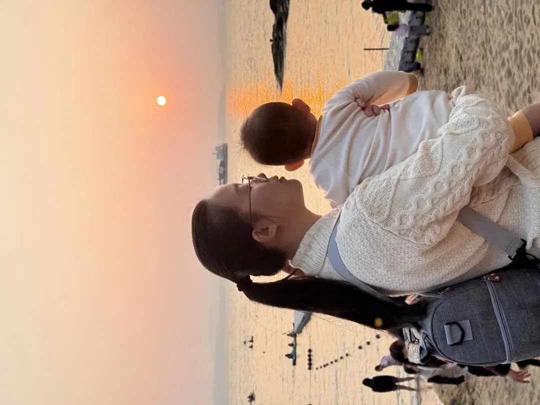 妈妈笑给和宝宝拍照,远处的落日正缓缓沉入海平线,霞光把海面染成暖金色。涨潮了,我们把宝宝抱去海边。海水漫过脚背,宝宝的小脚丫第一次感受到海水的凉意。她瞪大了眼,仿佛在问:这是什么神奇的东西?