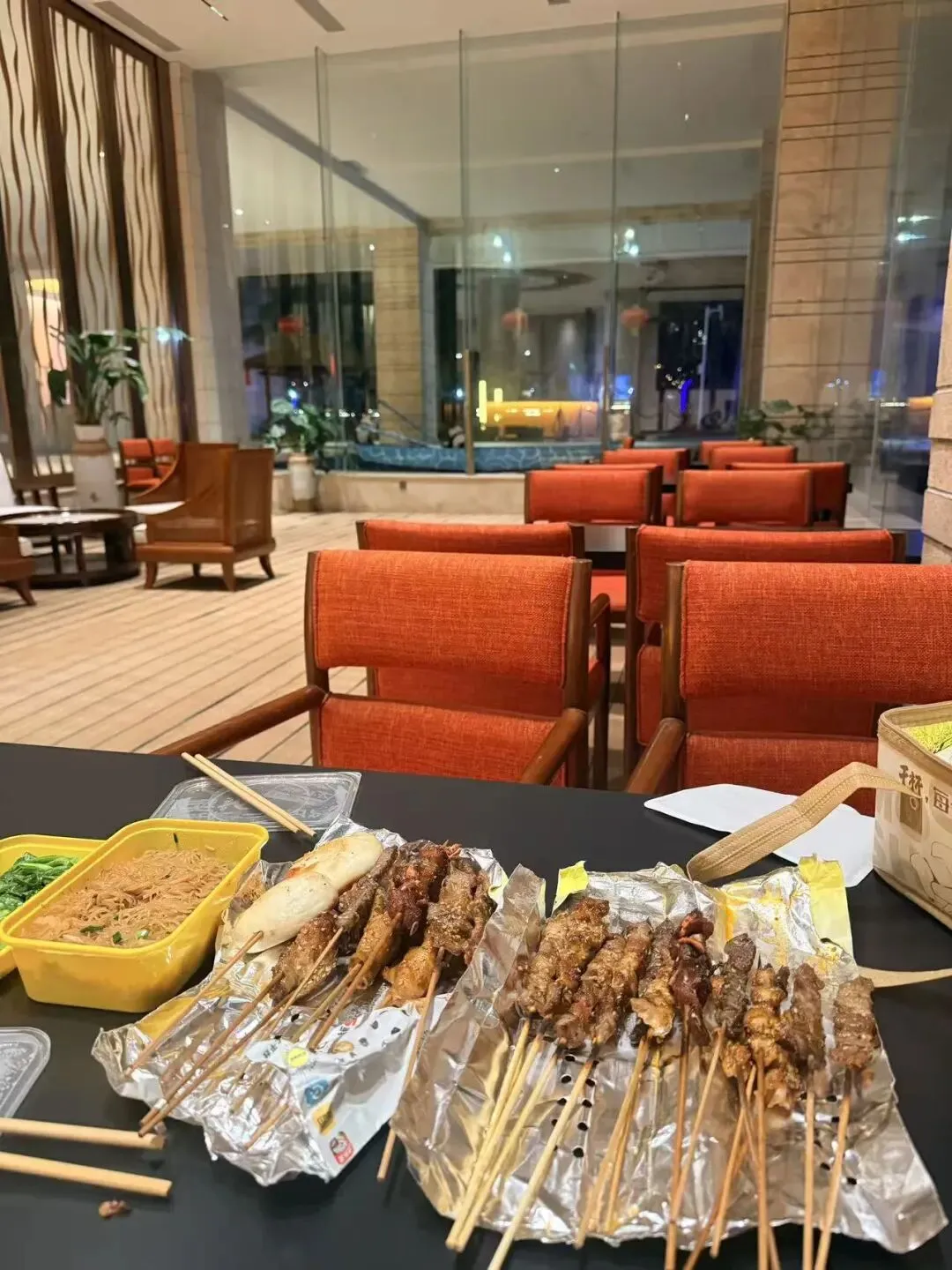 我们点了木屋烧烤和奶茶,在酒店大堂的桌上吃。老婆兴致盎然,还想喝一下啤酒。我说明天还得开车呢。手机里传来宝宝的呼吸声,偶尔一声哼唧,我们同时放下筷子,确认她只是翻个身,又相视一笑。
