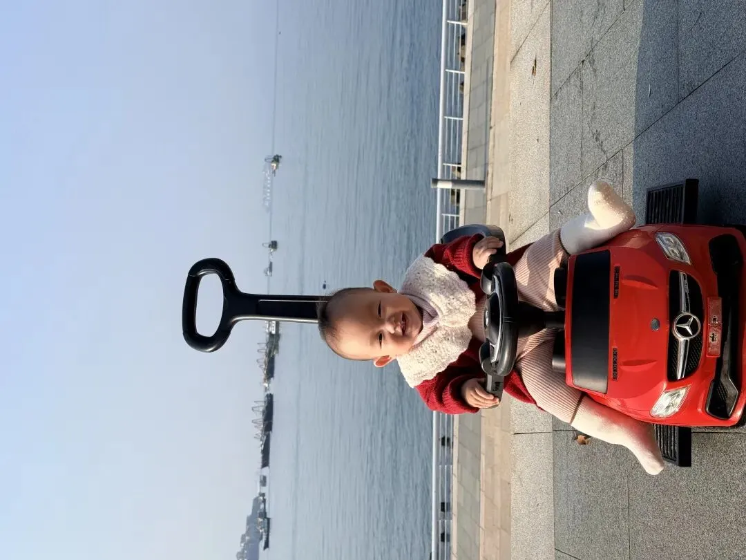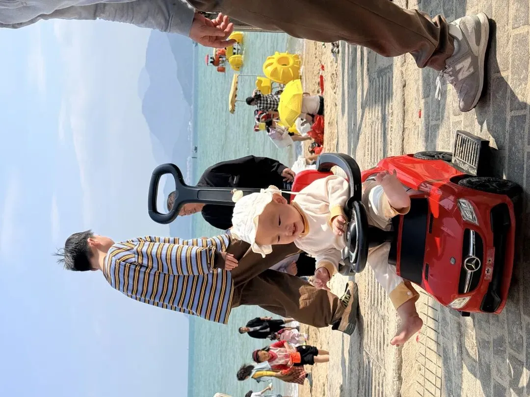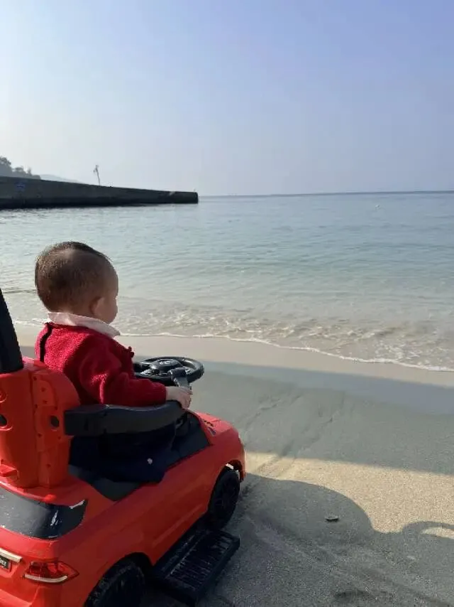 妈妈抱着宝宝坐在秋千上,迎着海风荡漾。宝宝坐在玩具车里,从海边走过。她对海水很好奇,我们停下来,静静地眺望。这一刻,时间仿佛慢了下来。