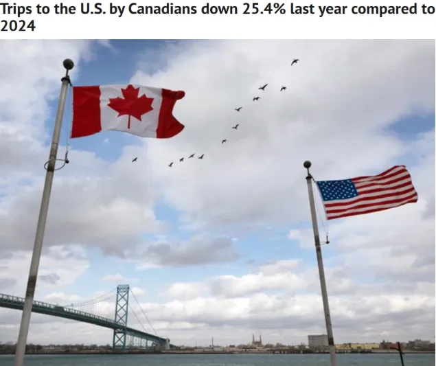 与2024年相比,去年加拿大人赴美旅游人数下降25.4%