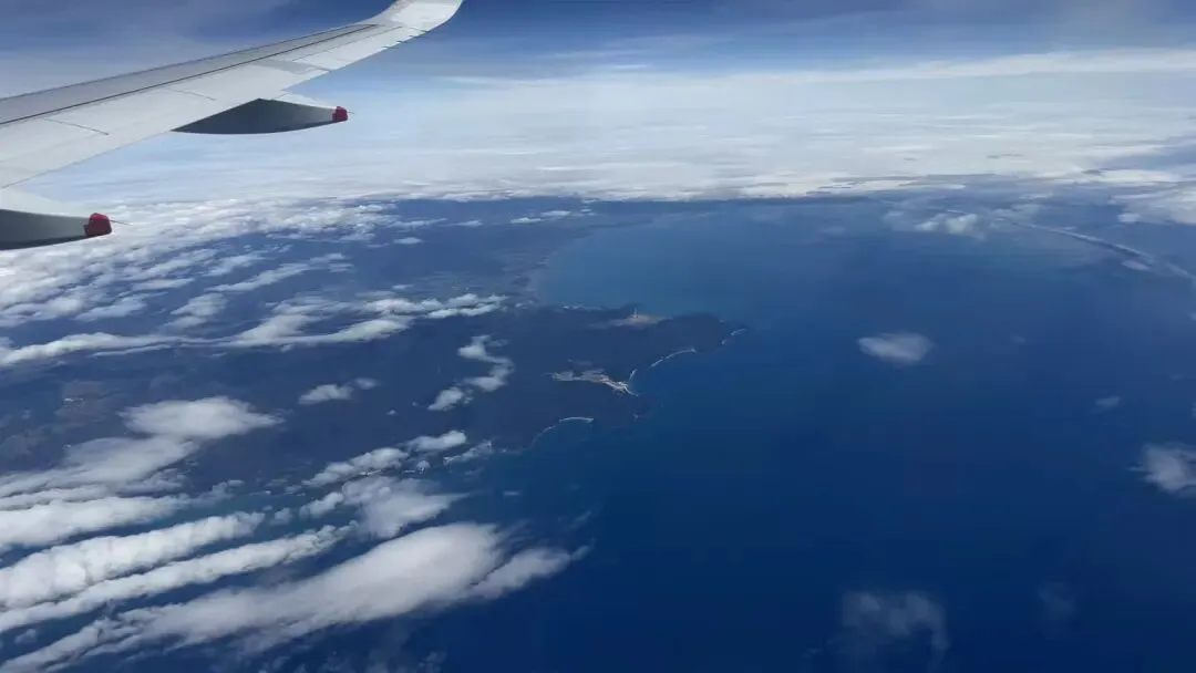 飞行时间1.5小时,可看碧海辽阔,金色海岸线有白色海浪线层层叠叠亲拥,白云之下偶有成群白光,感觉是海鸥飞过。