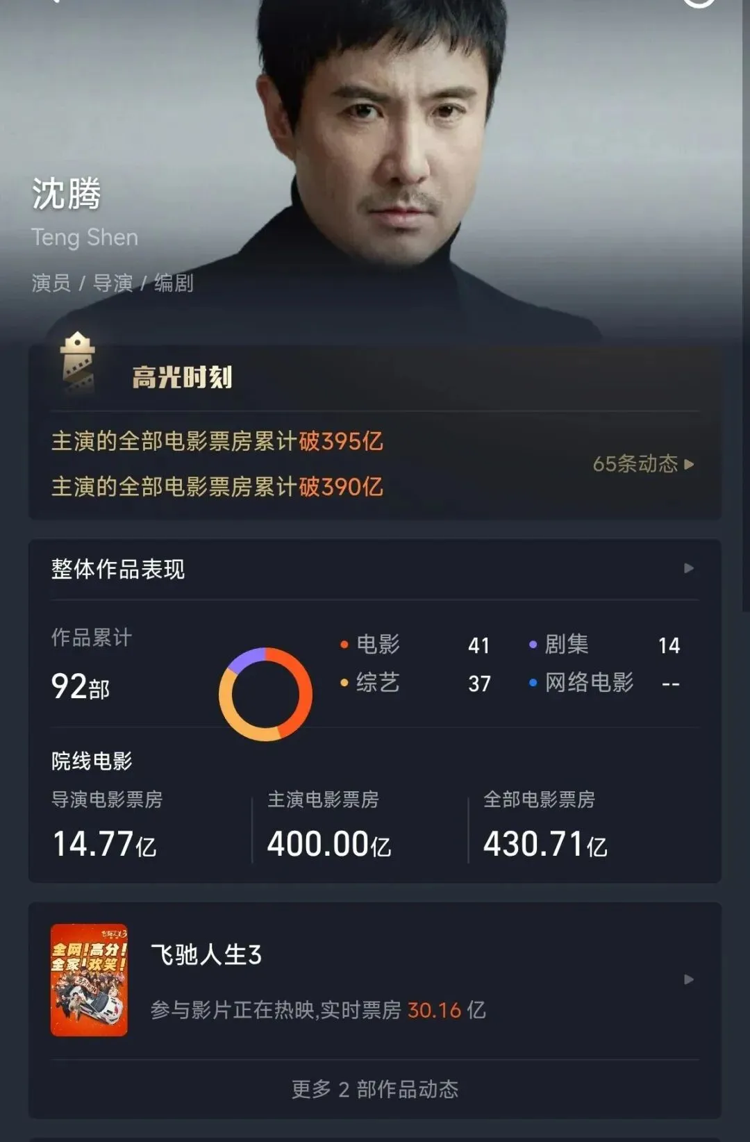 据潇湘晨报消息,灯塔专业版数据显示,截至2026年2月24日14:38,沈腾主演电影共25部,总票房超过400亿,成为首位主演电影票房破400亿的演员。今年大年初一由沈腾主演的电影《飞驰人生3》,上映八天就收获了30.16亿票房,领跑春节档。