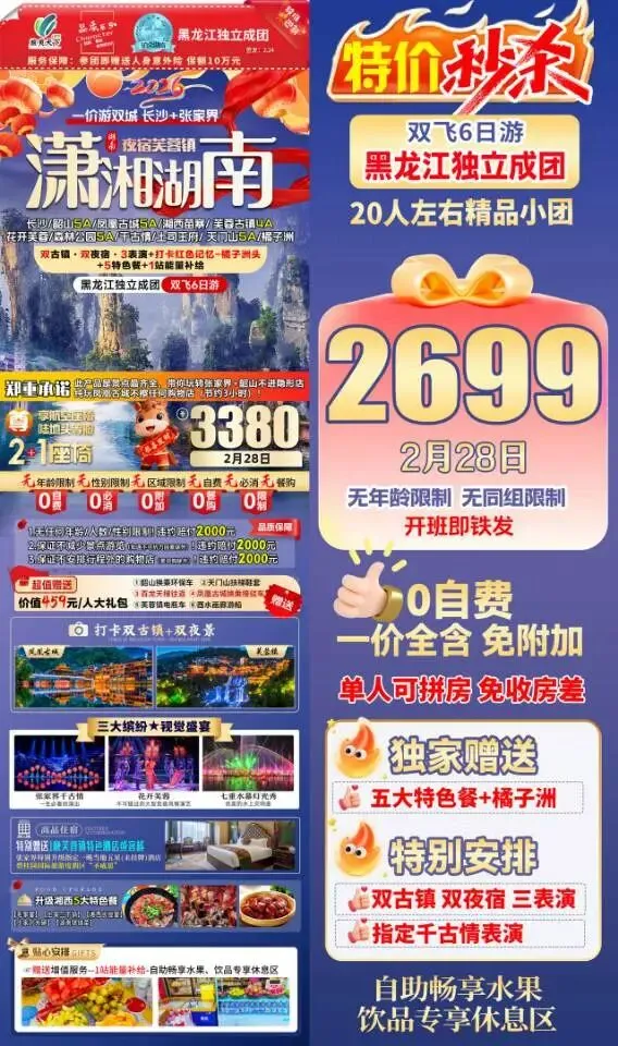 【肇东纵横旅游年后团】 2月28日潇湘湖南6日游 黑龙江独立成团