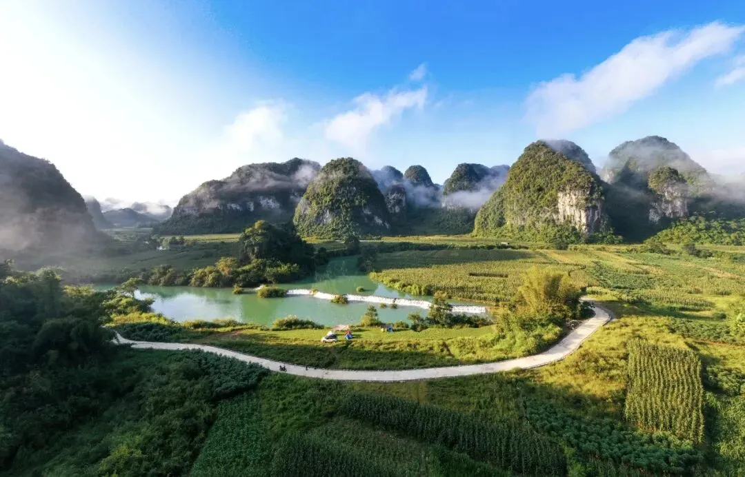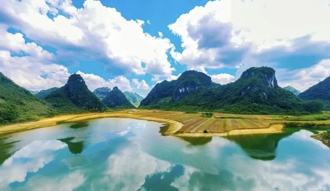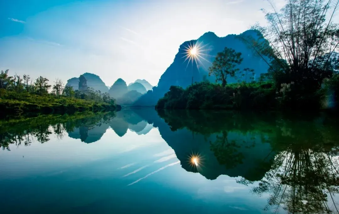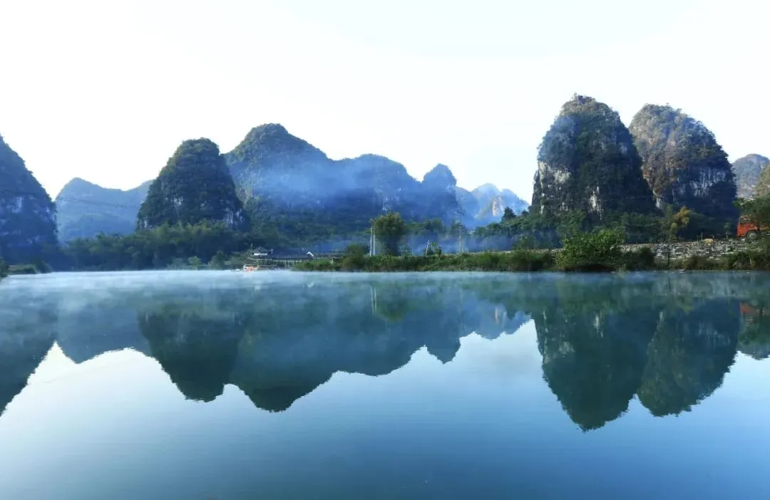 浩坤湖,被喀斯特峰林环抱,湖水如翡翠,可免费环湖徒步,欣赏渔翁亭、猪笼洞等景点,感受山水画般的意境。