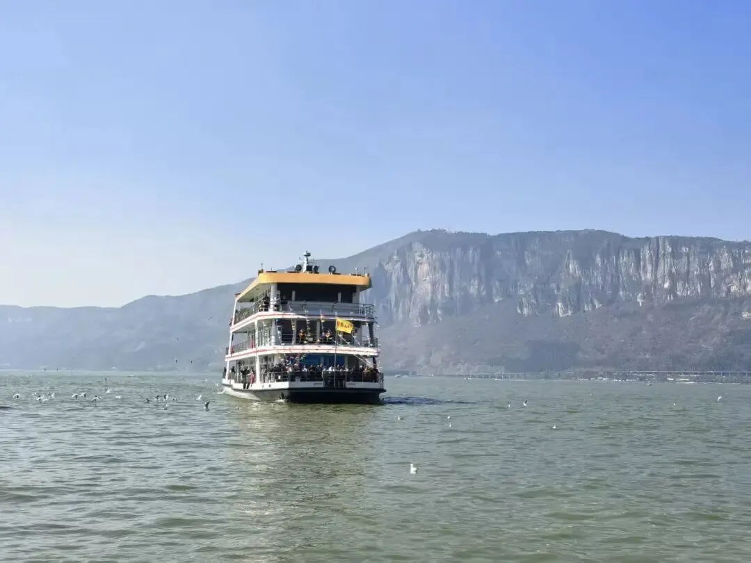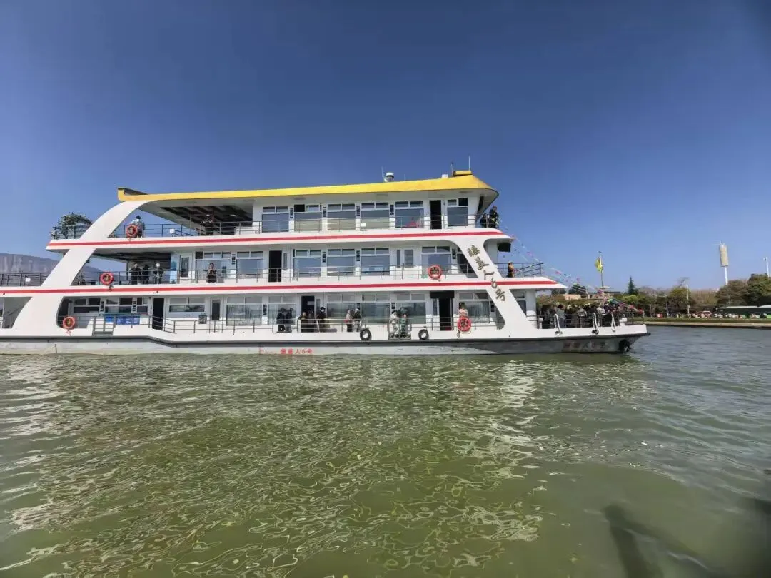 随后就是乘船游览,有普通观光船,100元/人;豪华游轮,145元/人;快艇100元/人。因为普通观光船和豪华游轮没有票,只能选择乘坐快艇,说是游玩时间是1小时,但实际也就半小时左右,在滇池跑一会就返程了,在滇池里看岸边的风景挺漂亮,偶尔会有少许的海鸥跟随。