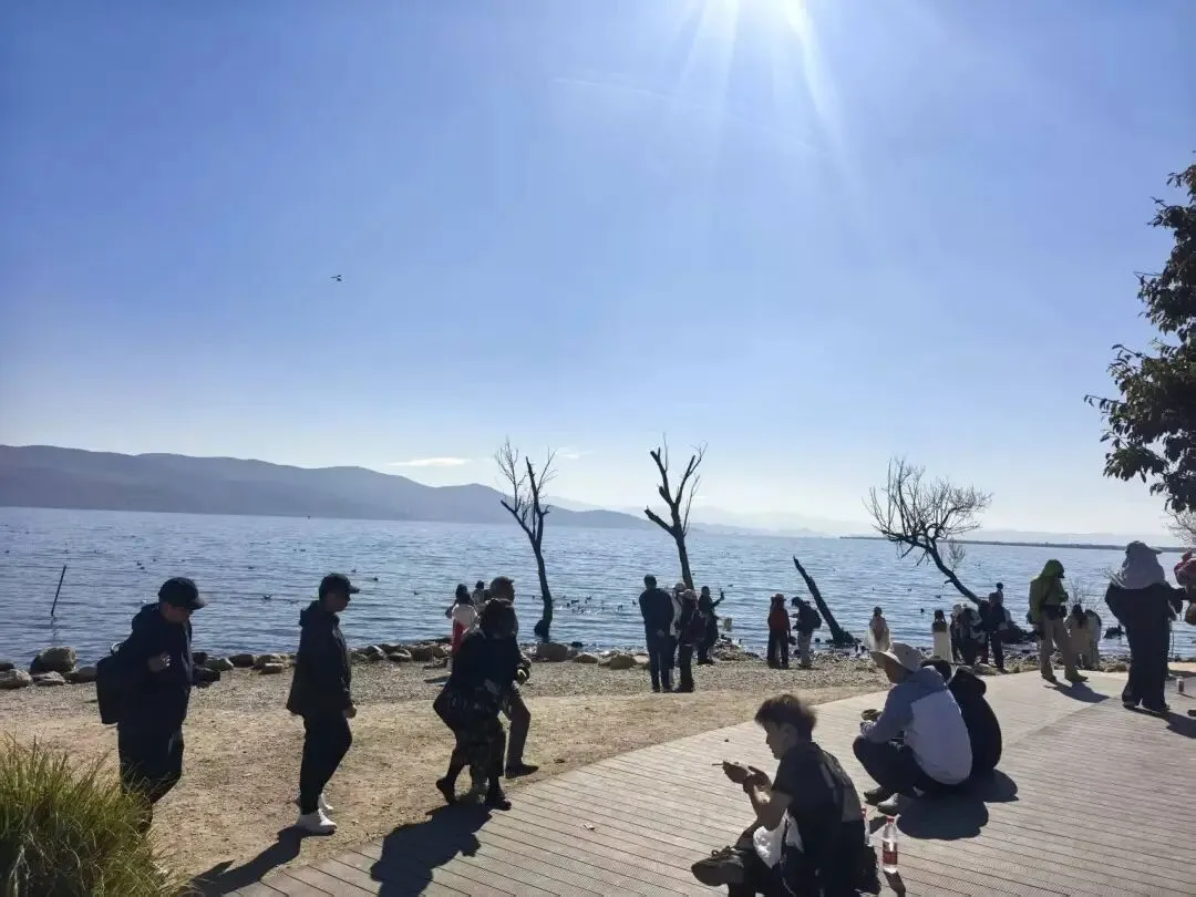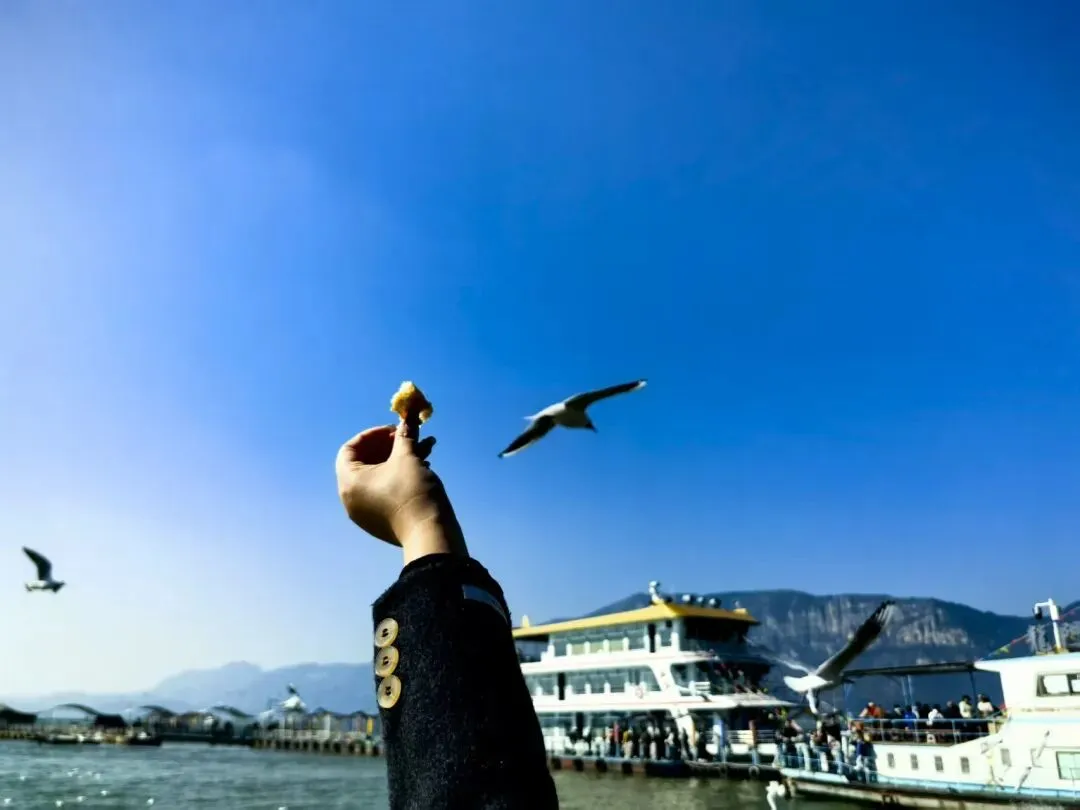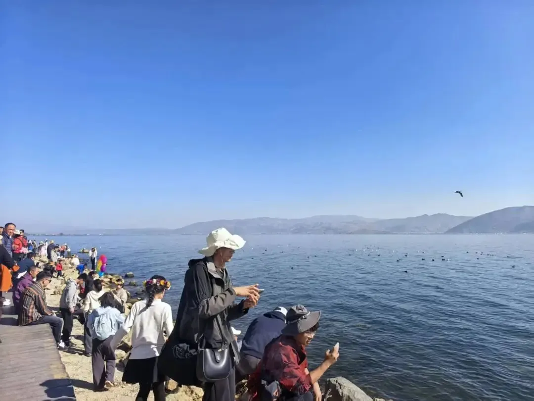 滇池给人的感觉很大,像大海一样,春节期间滇池能看到很多海鸥,在路边买了10块钱的面包准备去喂海鸥,但一口都没送出去。据景区人员说,晴天海鸥不太出来,即便出来也不愿意吃东西,阴天要好一点,但阴天拍照又不好看,总之不能两全其美。