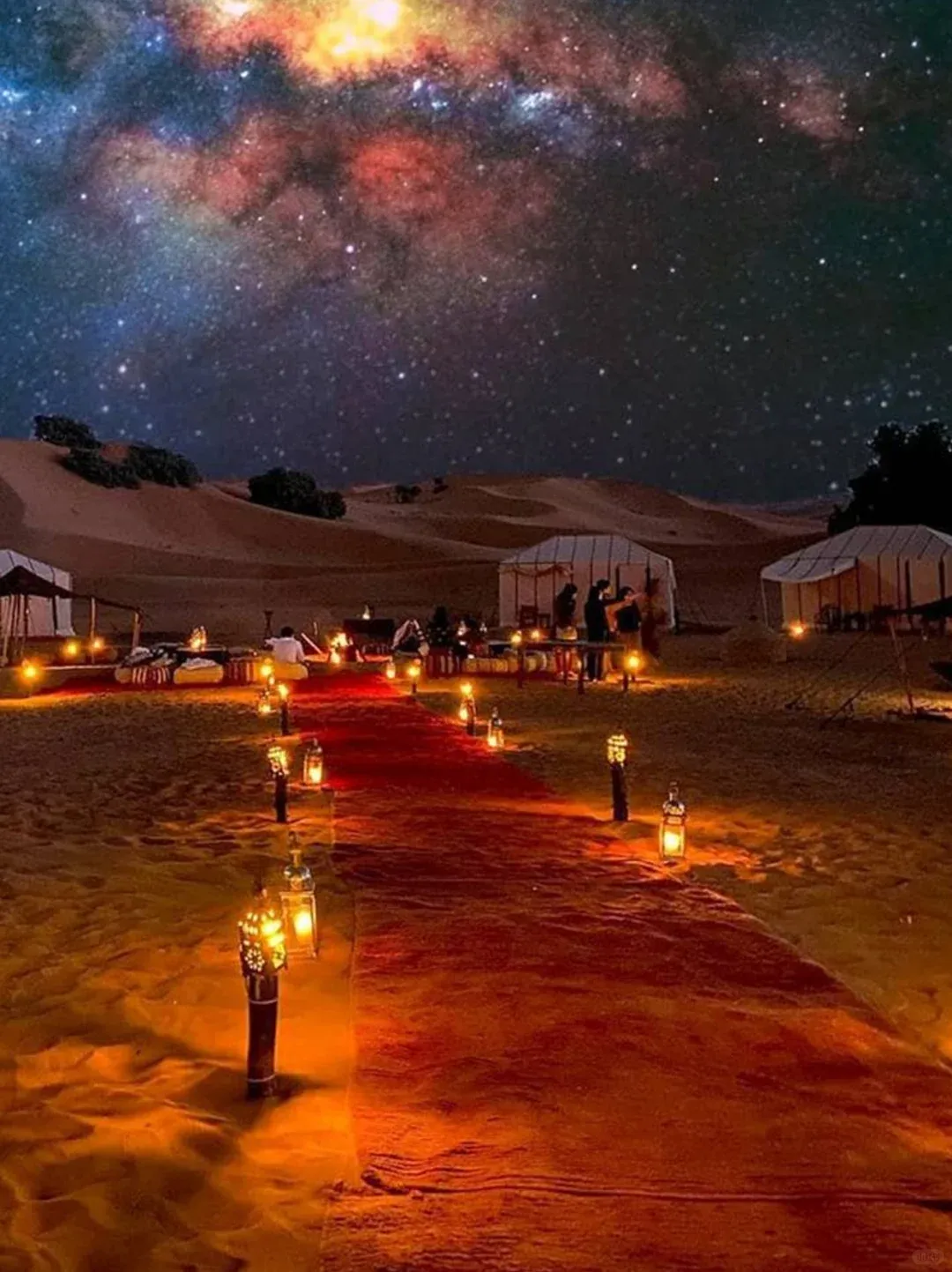 当夜幕降临,璀璨星空与寂静沙漠相互呼应,此时地沙漠是闪闪发光地黑色,美得让人失语。