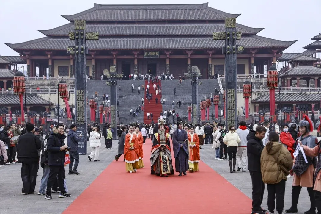 春节期间,横店影视城各大园区精心筹备,推出了一系列沉浸式、互动式文旅活动,让游客在游玩中感受传统文化魅力,收获别样新春体验。秦王宫园区入口处,小丑互动提前点燃欢乐氛围,秦王迎宾、芈月巡游、大秦机甲等多场互动体验秀轮番上演,带领游客沉浸式感受大秦盛世的恢弘气象。其中,“楚河汉界”成语演艺秀深受亲子家庭青睐,不少孩子在实景演绎中深化了对课本历史知识的理解。清明上河图园区区内“300+”NPC全天候在线接戏,结合春节特色推出专属玩法,兼顾不同群体需求,让每一位游客都能过足“戏瘾”。值得一提的是,春节期间,景区推出“横店入戏中国年限定片酬”,不仅可以兑换文创好物收获新年“战利品”,更兼具纪念意义。