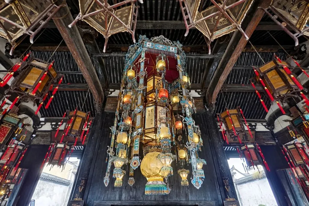 走进卢宅景区,核心建筑肃雍堂内,一盏巨型堂灯瞬间攫住众人目光。这盏制作于 1918 年的宝盖索络联三聚七彩穗羊角灯,通高 4.05 米、直径 2.10 米的灯体上,40 万颗玻璃彩珠在灯光下熠熠生辉,光影流转间,静静诉说着百年岁月的故事。全新升级的肃雍堂文化展陈区内,复原的卢氏家族生活场景、精美的东阳木雕、古朴的明清家具错落排布,游客们驻足端详,伸手触摸非遗技艺的温度,在沉浸式互动中,读懂东阳“三乡文化”的深厚底蕴。