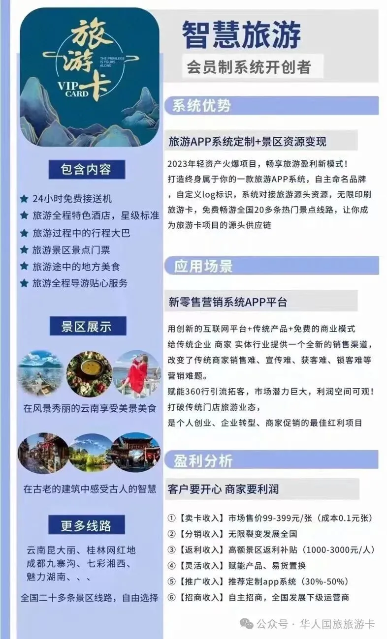 免费领取价值2000元的《旅游卡创业揭秘》,随着社会运行逐步回归常态,旅游市场也迎来持续向好的复苏态势。为促进地方文旅产业恢复活力,各地相继出台了一系列扶持政策和激励举措。在此过程中,旅游卡作为一种新兴的旅行消费模式,正获得越来越多游客的青睐。不过,关于旅游卡的产品可靠性、低价机制以及代理业务的长期可行性,市场上仍存在一些疑问。下文将从运行逻辑与收益来源两个角度展开分析。