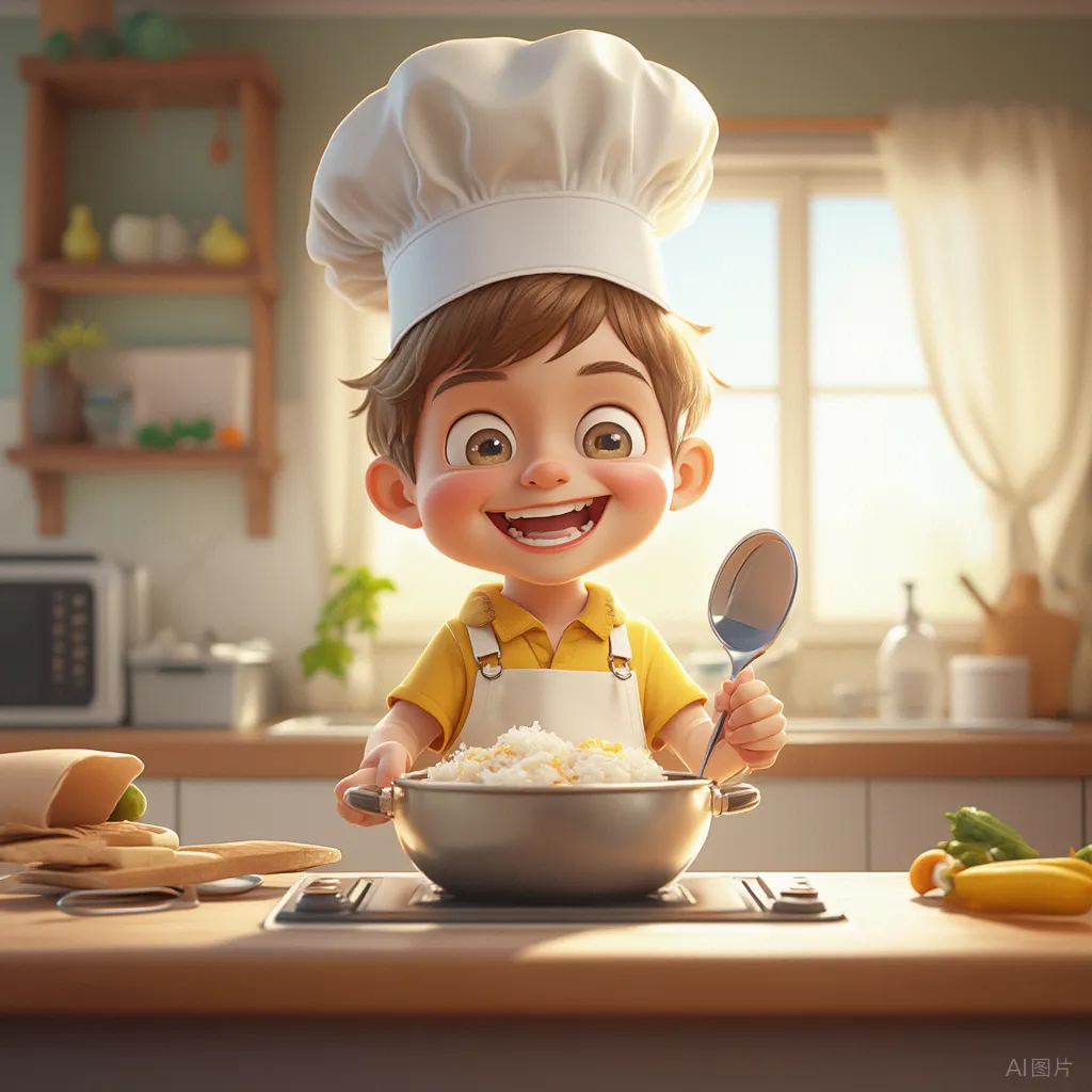 今天是“厨房美食日”。他要当厨师,教我做饭。其实就是他洗菜,我切,他往锅里倒,我炒。做完了一盘炒鸡蛋一盘炒青菜,卖相不咋地,但他吃得特别香,还非要摆盘,说是“餐厅风格”。