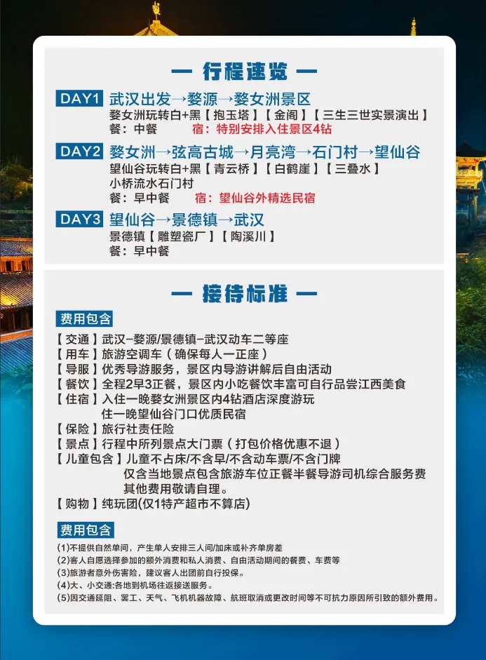 4、交通:含武汉-婺源/景德镇-武汉往返高铁/动车二等座;当地旅游大巴车