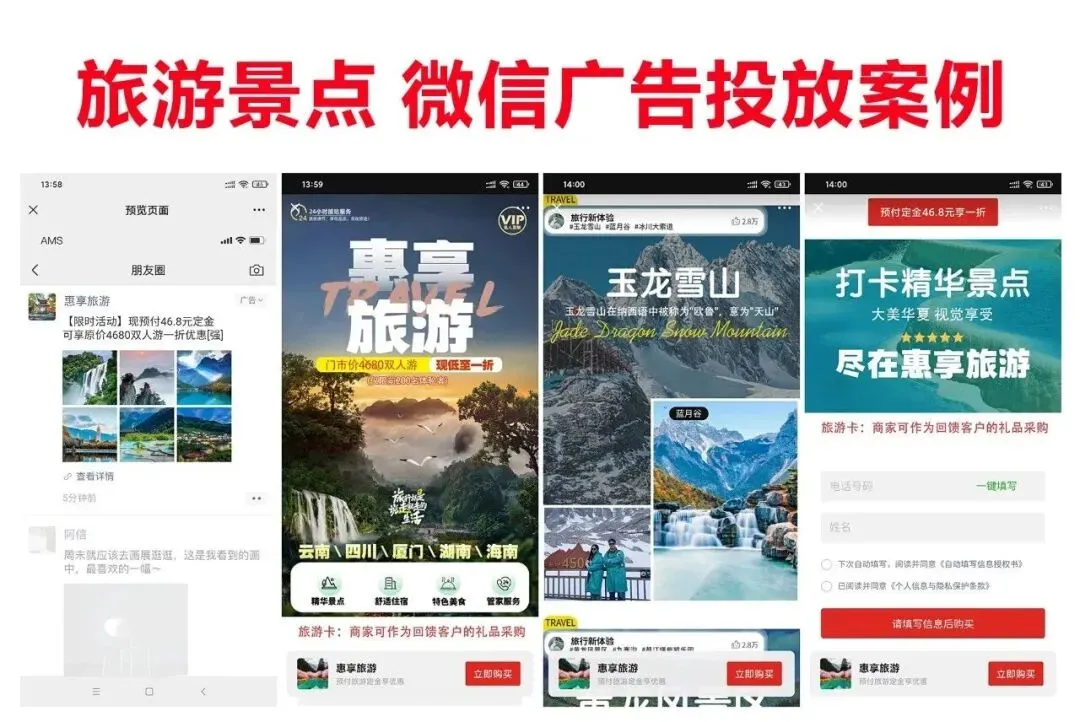 第二,形式灵活,贴合旅游宣传,吸引力拉满。朋友圈广告支持图文、短视频、卡片等多种形式,刚好适配旅游行业的宣传需求