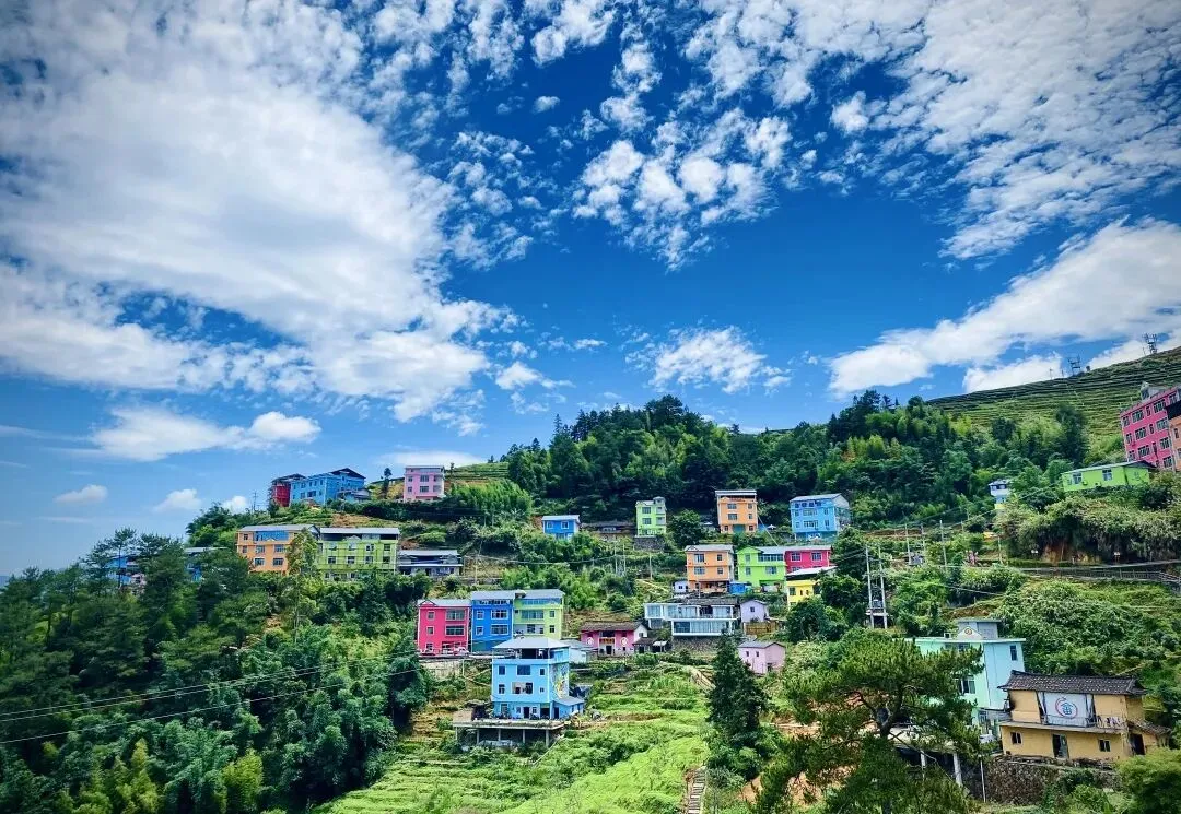 俯瞰官畲,青山秀水环抱着一座座彩色的楼房,仿佛是山间悬挂着的彩虹。