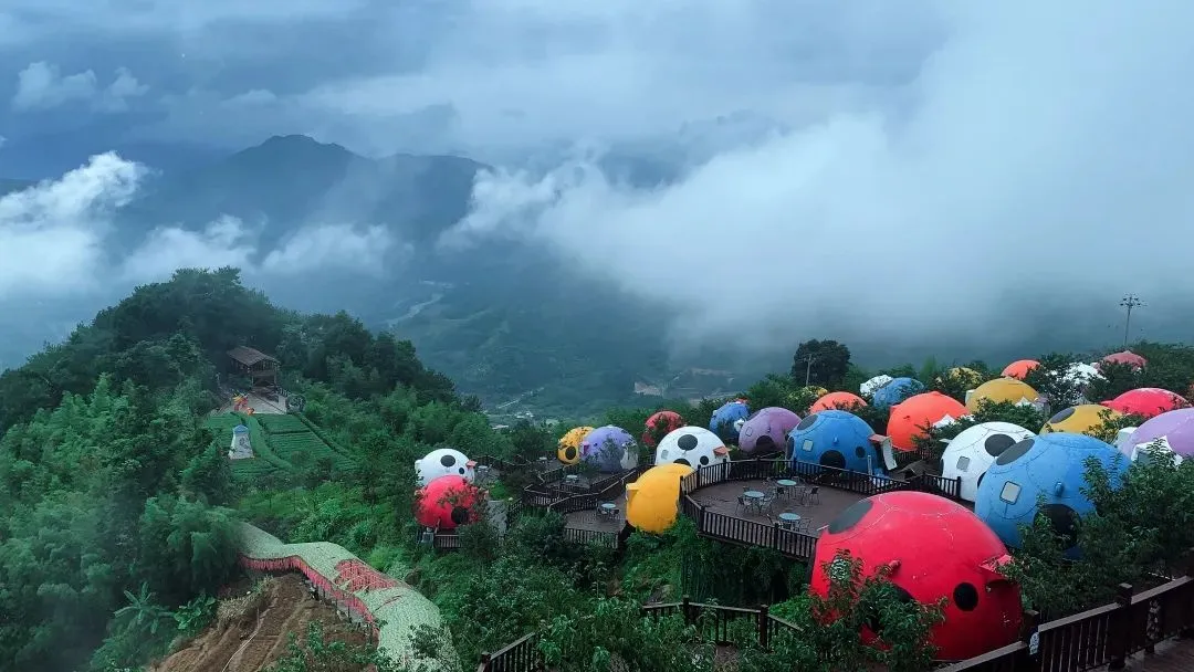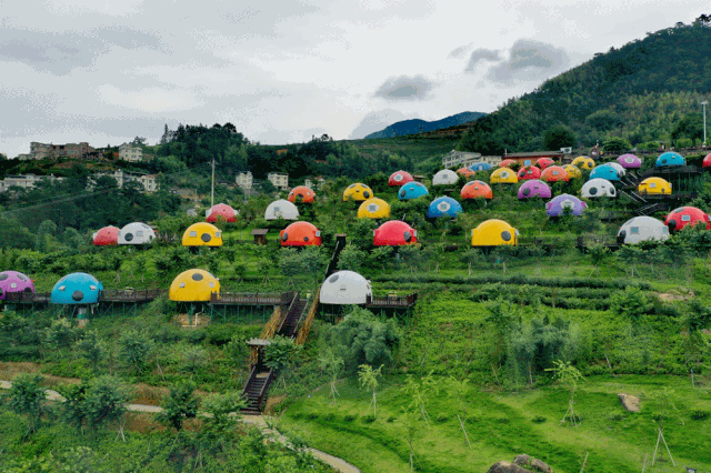前往【七星瓢虫露营基地】在青山绿水间,红的、白的、蓝的、黄的…..七星瓢虫屋点缀其中,给绿色的山林增添了许多活力,仿佛这里就是七星瓢虫温暖的家。