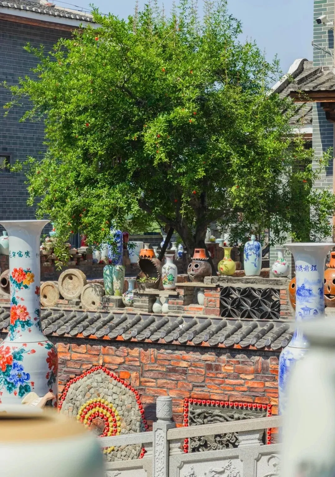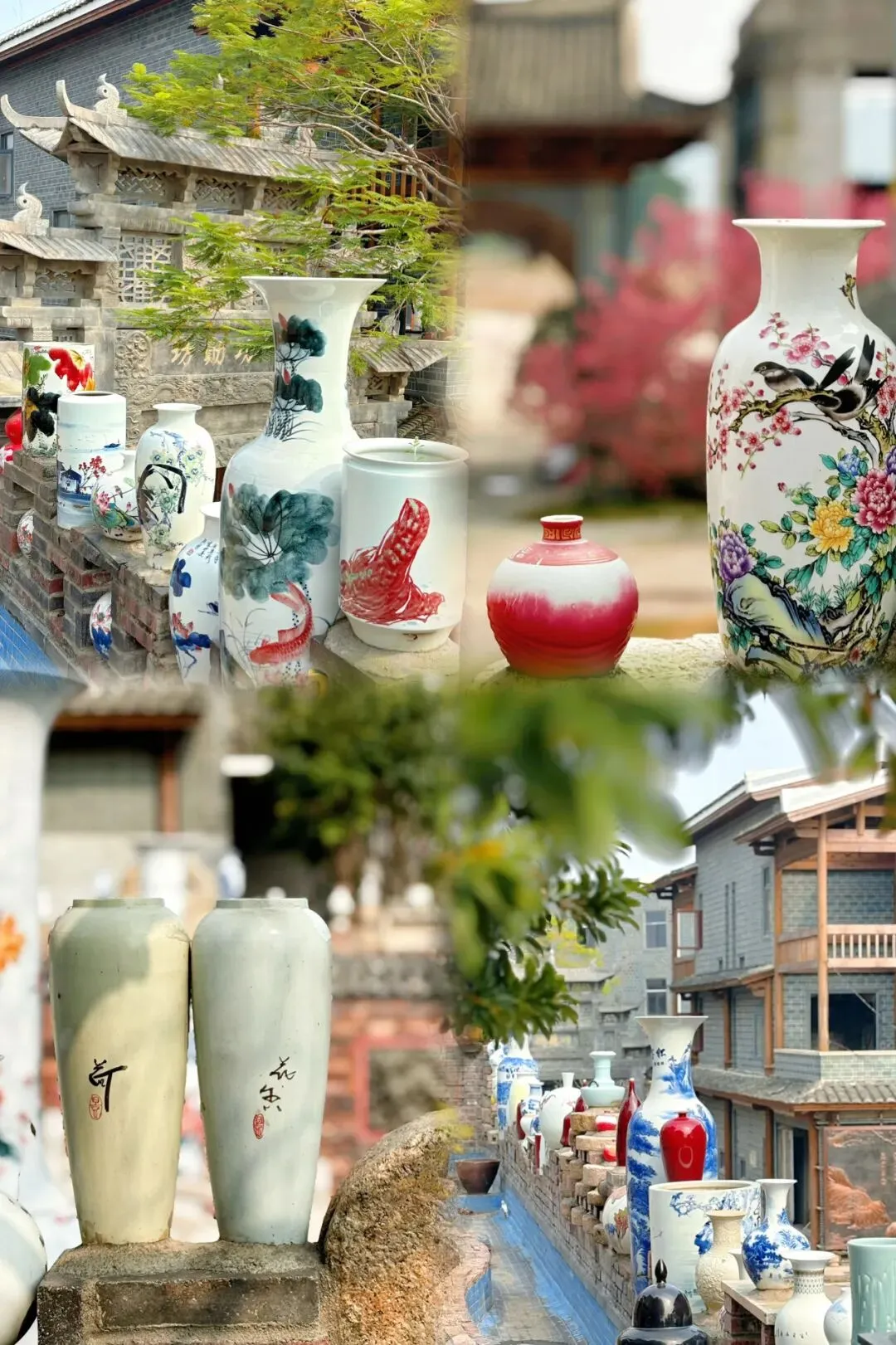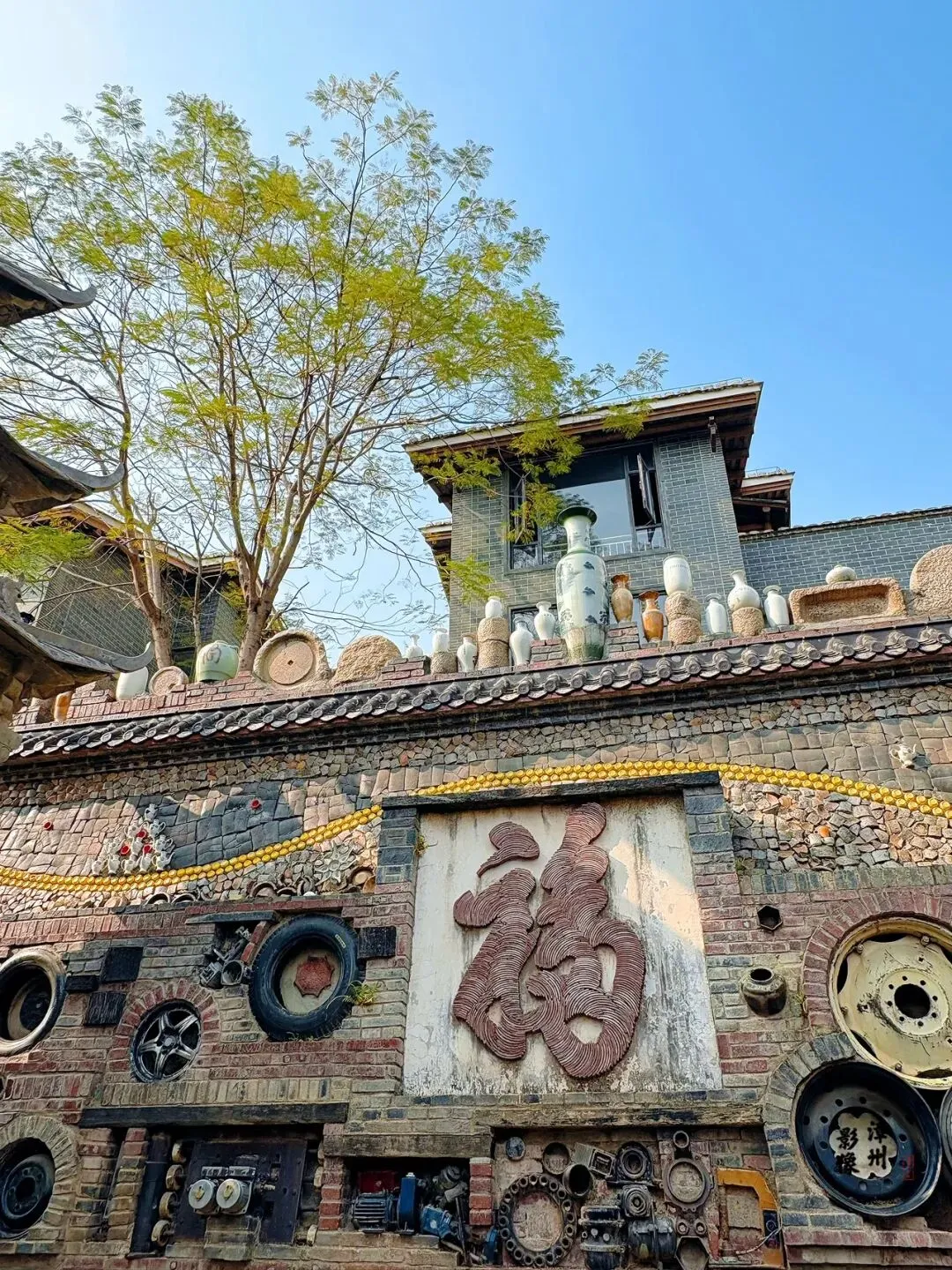 新来福小镇以陶瓷花瓶为特色,将陶瓷艺术融入到了各个角落,通过将花瓶、轮胎、石磨与建筑结合,创造出一种新颖的视觉体验,既美观又富有创意,漫步其中仿佛置身于一个陶瓷艺术的殿堂。