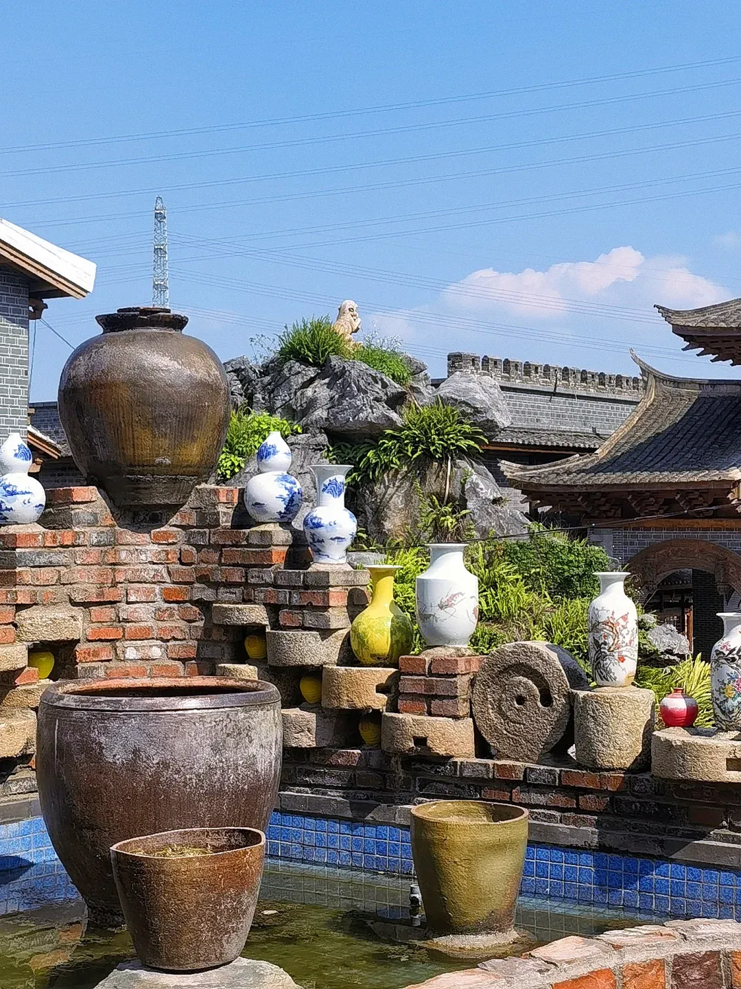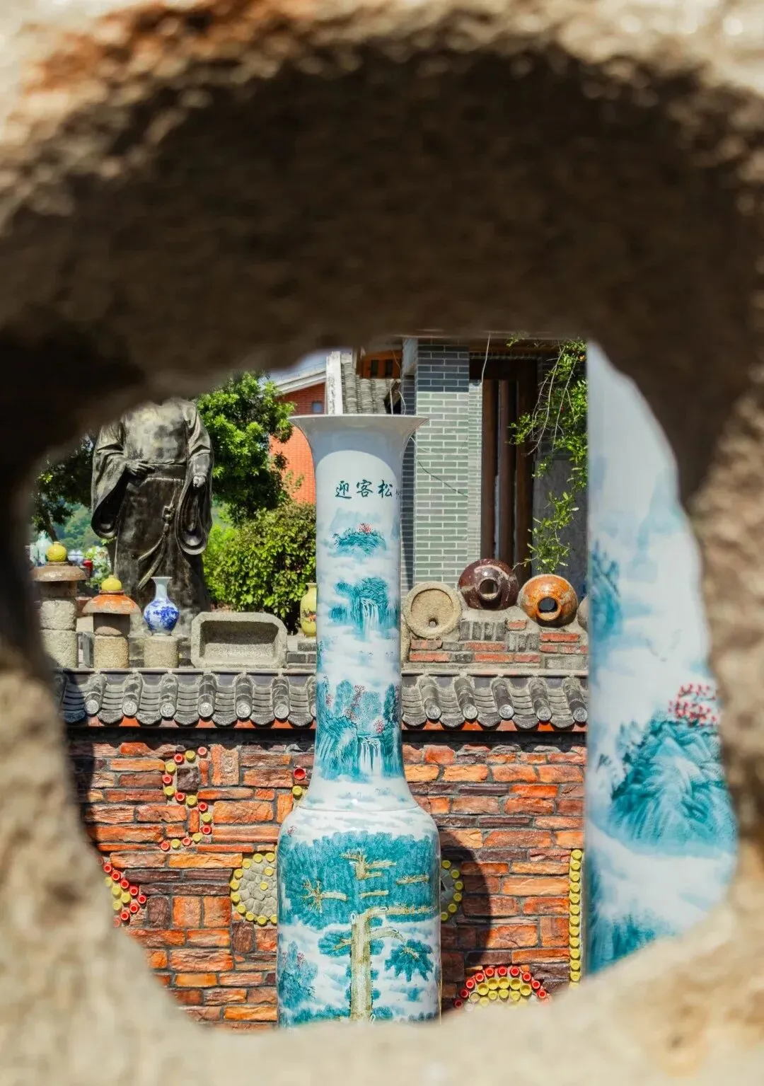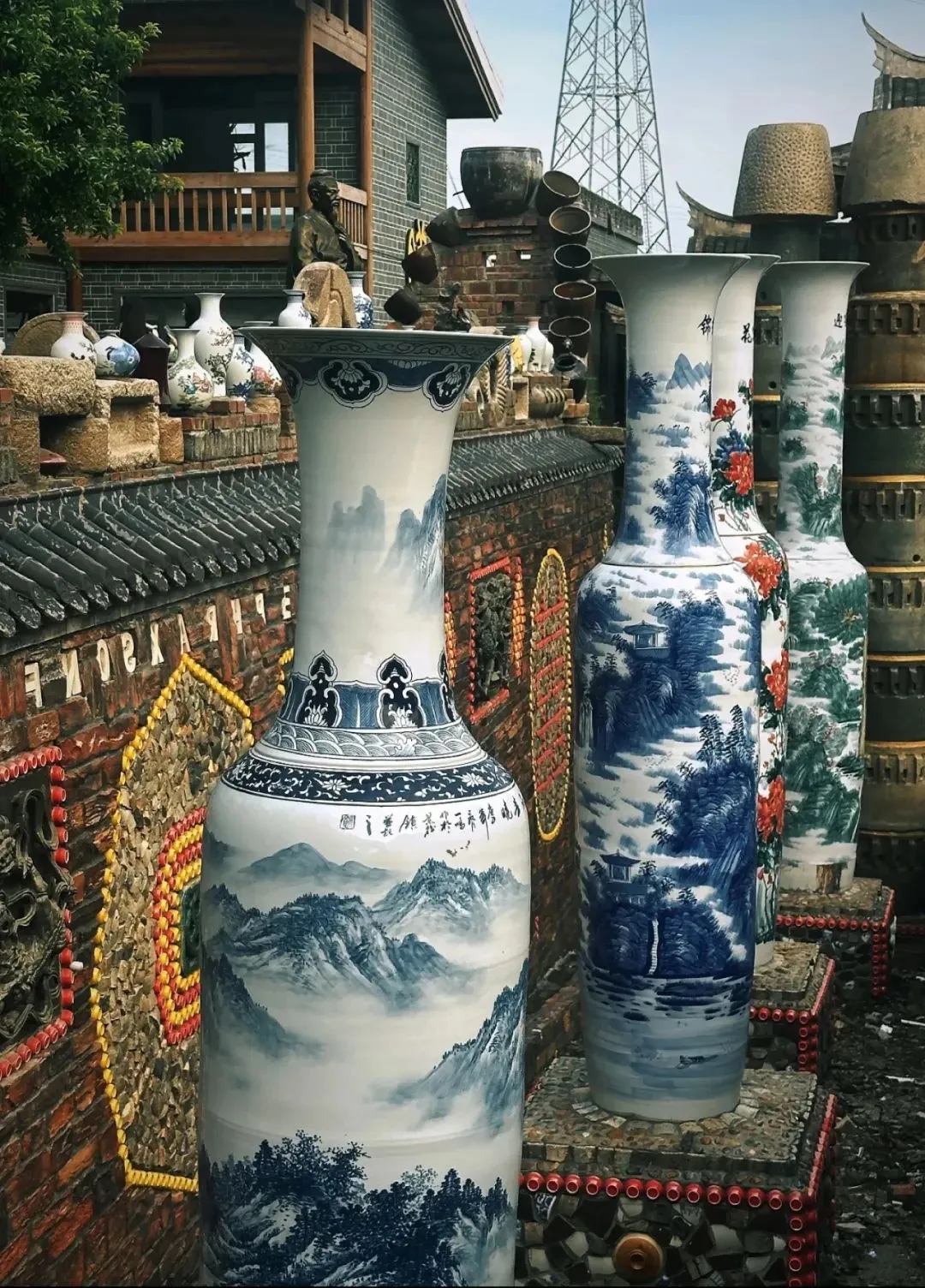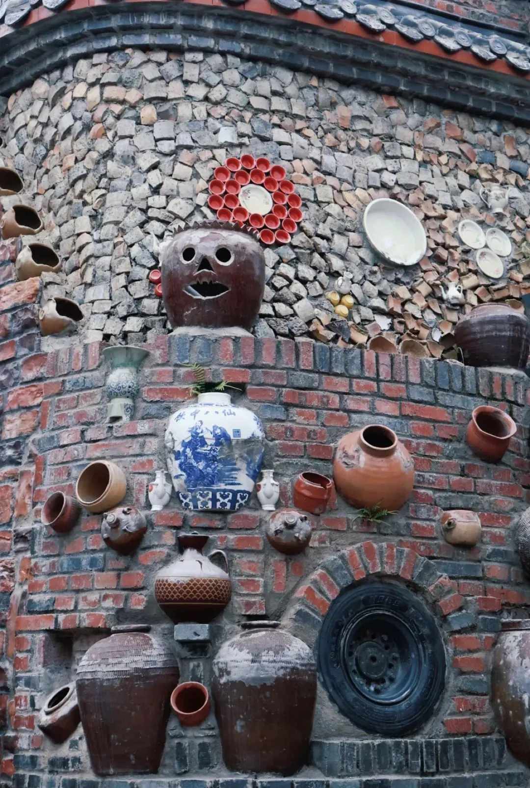 新来福小镇以陶瓷花瓶为特色,将陶瓷艺术融入到了各个角落,通过将花瓶、轮胎、石磨与建筑结合,创造出一种新颖的视觉体验,既美观又富有创意,漫步其中仿佛置身于一个陶瓷艺术的殿堂。